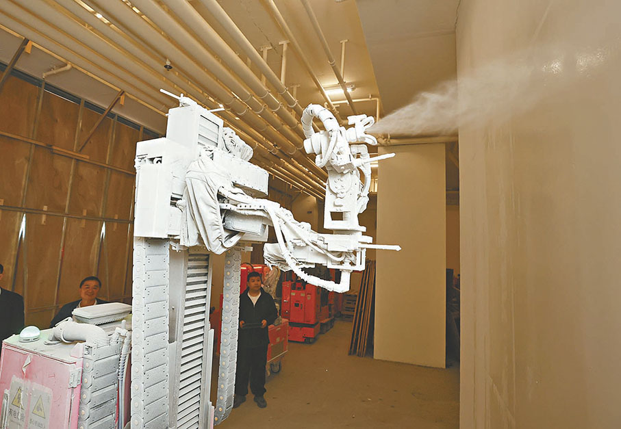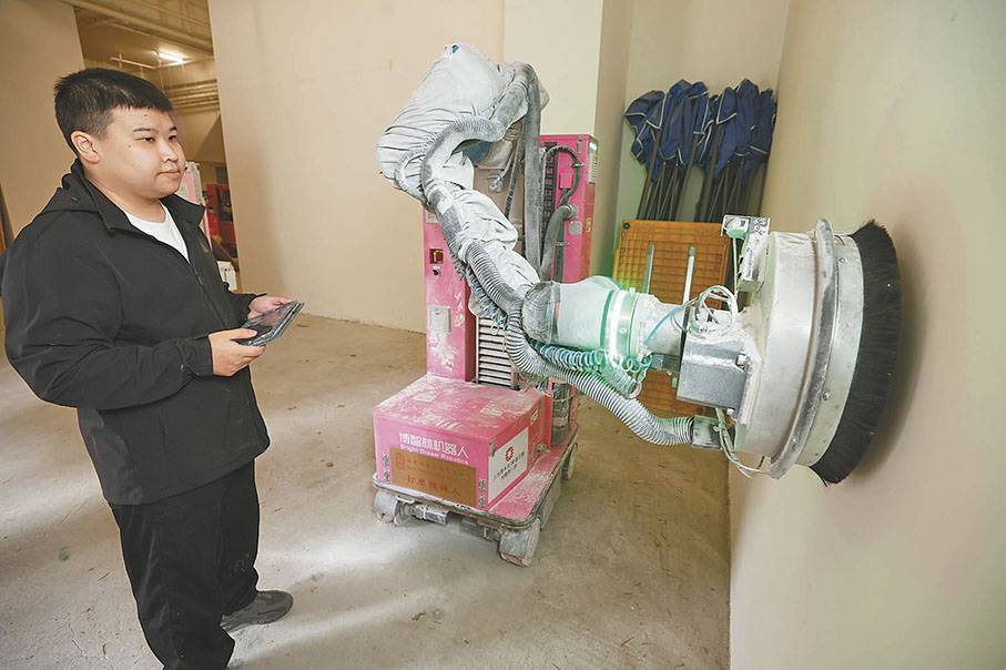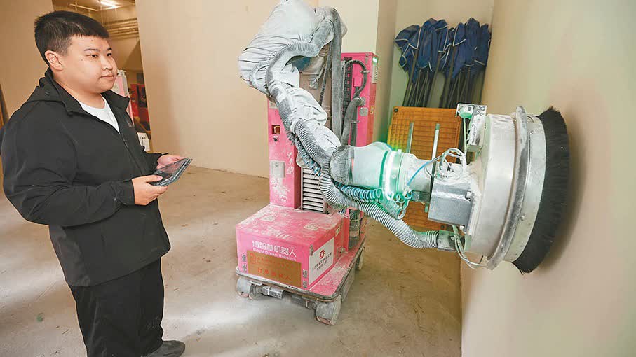 走進位於上水的公屋工地,一部智能機械人正有條不紊地執行牆面髹油的工作。它以雷達掃描牆面,根據預先輸入的圖紙,精準地避開燈具、窗戶等障礙物,自動完成髹漆工作。在隔壁一個單位,另一部機械人正進行批灰和打磨天花板。