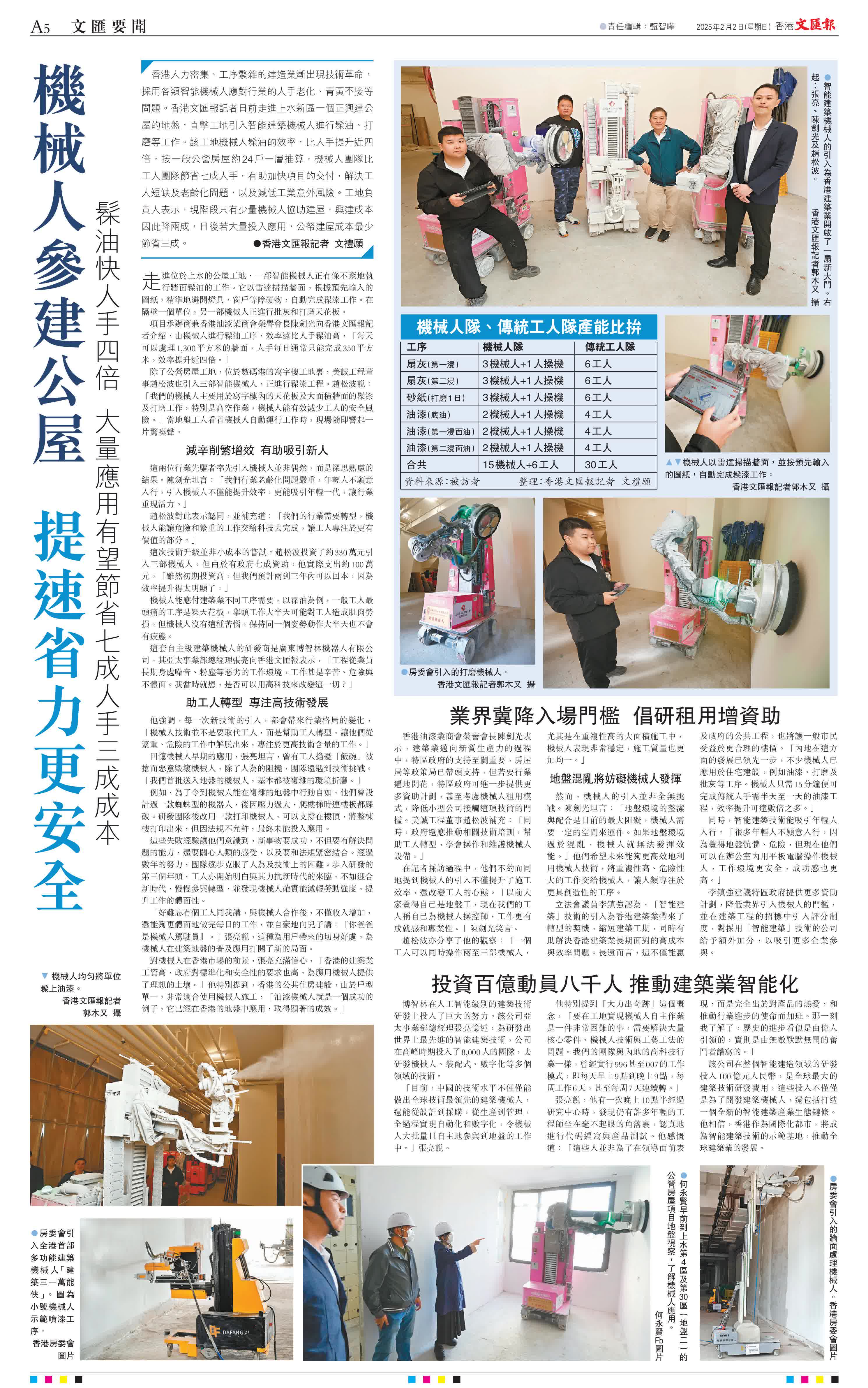 (香港文匯報記者 文禮願)香港人力密集、工序繁雜的建造業漸出現技術革命,採用各類智能機械人應對行業的人手老化、青黃不接等問題。香港文匯報記者日前走進上水新區一個正興建公屋的地盤,直擊工地引入智能建築機械人進行髹油、打磨等工作。該工地機械人髹油的效率,比人手提升近四倍,按一般公營房屋約24戶一層推算,機械人團隊比工人團隊節省七成人手,有助加快項目的交付,解決工人短缺及老齡化問題,以及減低工業意外風險。工地負責人表示,現階段只有少量機械人協助建屋,興建成本因此降兩成,日後若大量投入應用,公帑建屋成本最少節省三成。