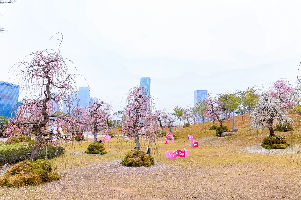垂枝梅是梅中的後起之秀,其大枝橫生斜垂,小枝輕盈弔掛,株冠傘狀撐開,姿態飄逸灑脫。主辦方為本次活動提供300餘株精品垂枝梅,經過精心策劃與執行,垂枝梅巧妙融合公園獨特的地形地貌與空間布局,營造出五大主題景點——梅香詩韻、鏡花水月、梅染春山、雪映鵬城、梅開五福。