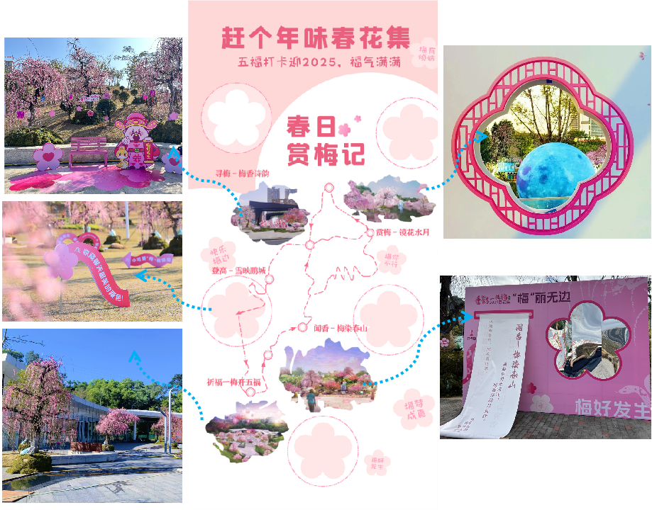 入園後,大家可領取一份遊園地圖,打卡五大主題梅景——梅香詩韻、鏡花水月、梅染春山、雪映鵬城、梅開五福。在地圖上集齊五個印章並分享至微信朋友圈/小紅書等平台,即可領取精美的活動禮品(數量有限,先到先得)。