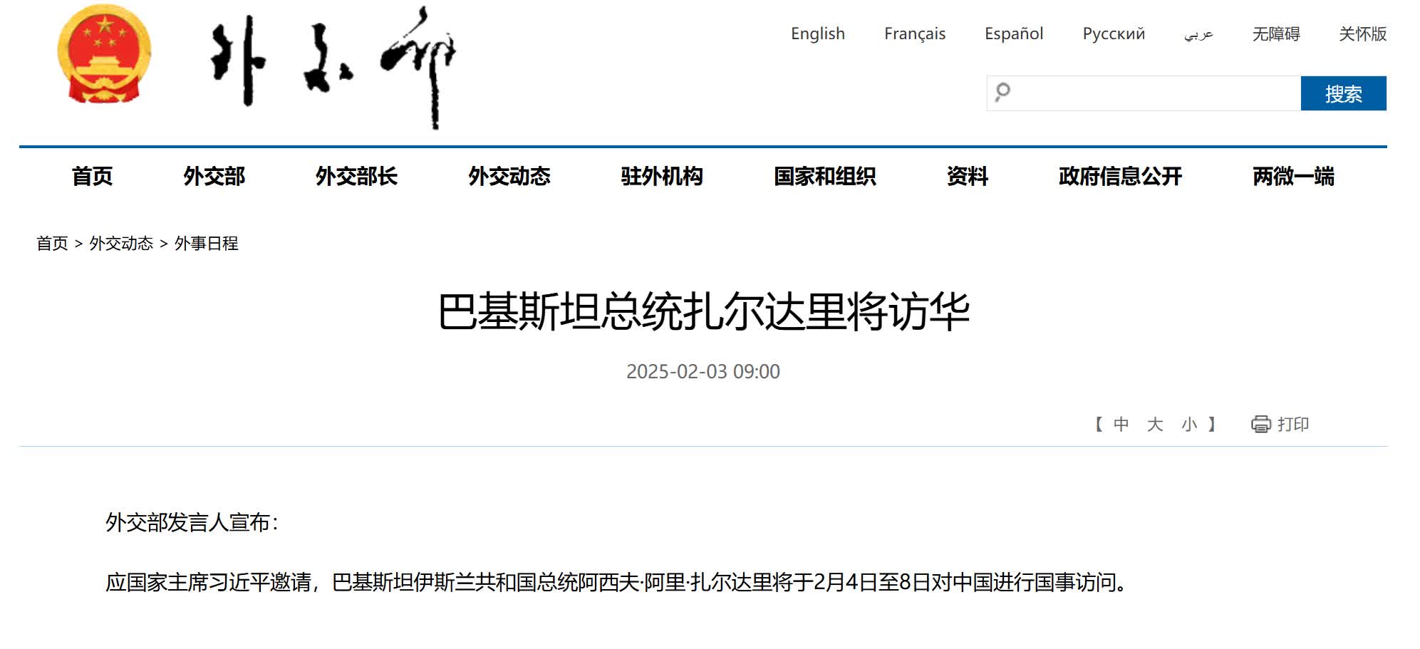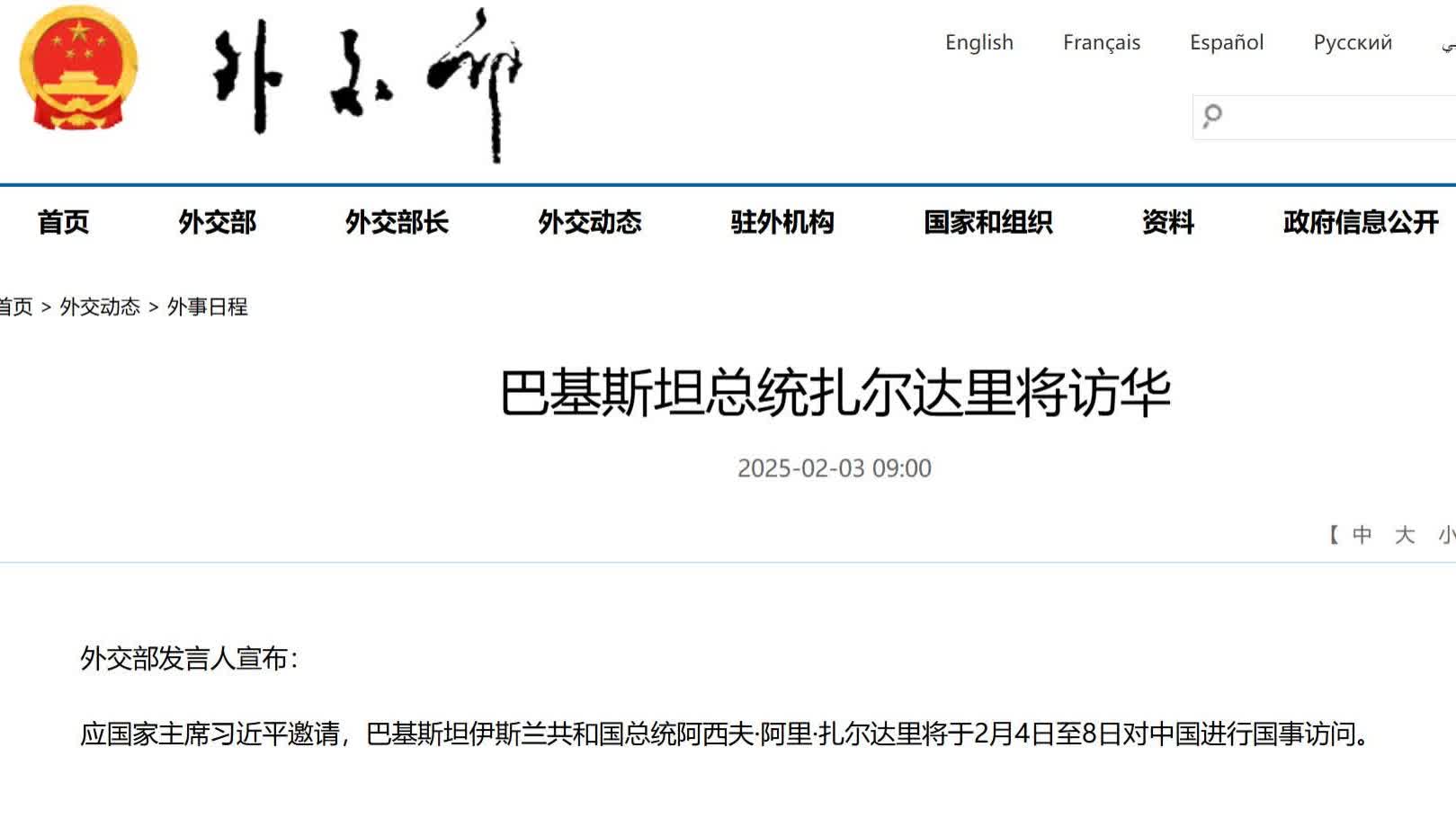 大公文匯網報道,外交部發言人宣布:應國家主席習近平邀請,巴基斯坦伊斯蘭共和國總統阿西夫·阿里·扎爾達里將於2月4日至8日對中國進行國事訪問。
