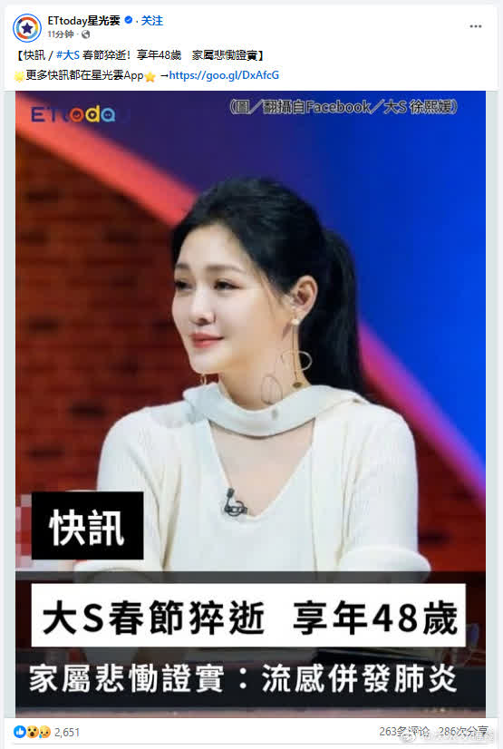 大公文匯網報道,FB粉專「日本旅人 旅遊 購物美食情報」昨日(2月2日)發文聲稱台灣有一名48歲女星過世,並間接透露是憑藉《流星花園》爆紅的大S(徐熙媛)。