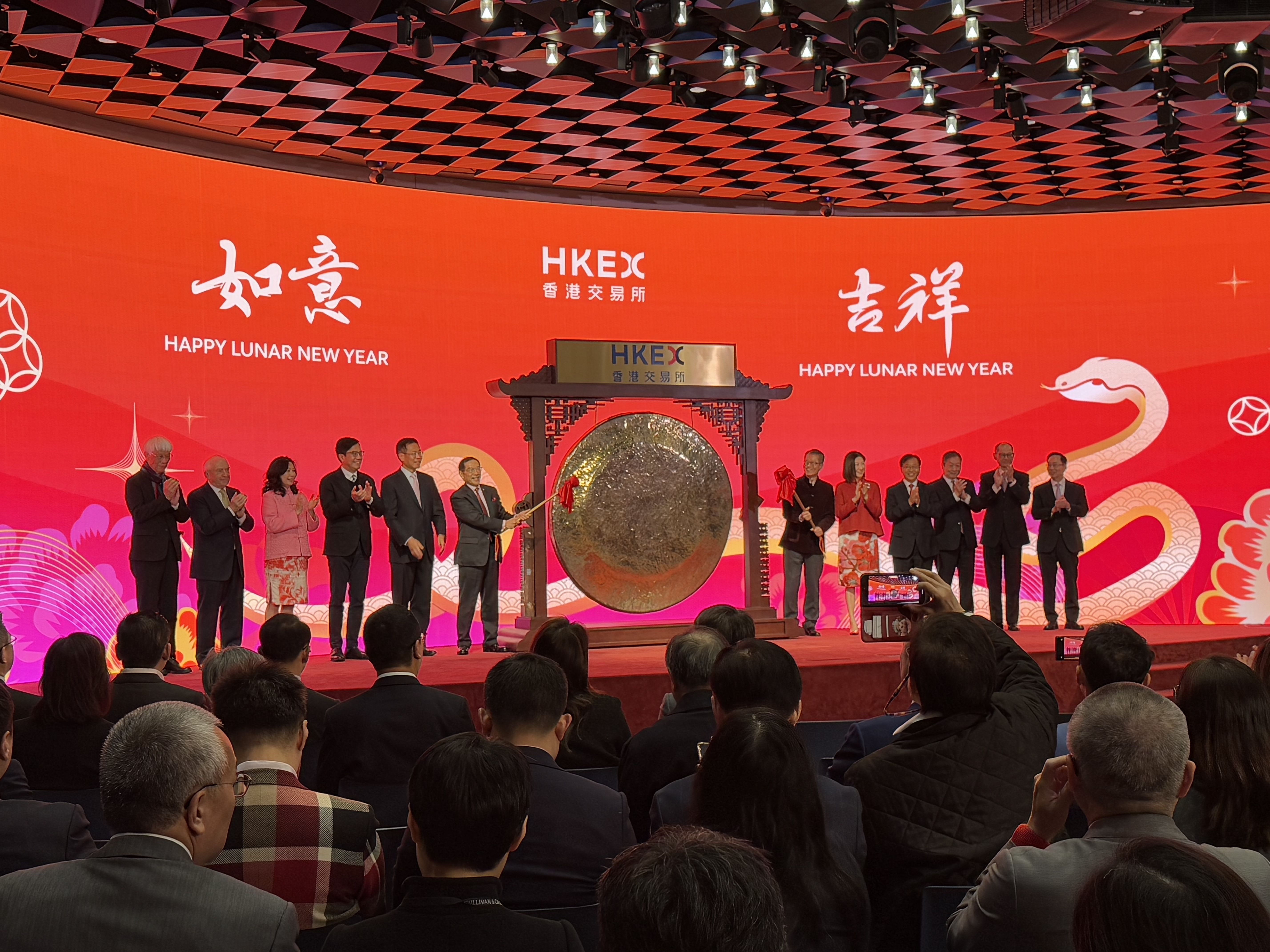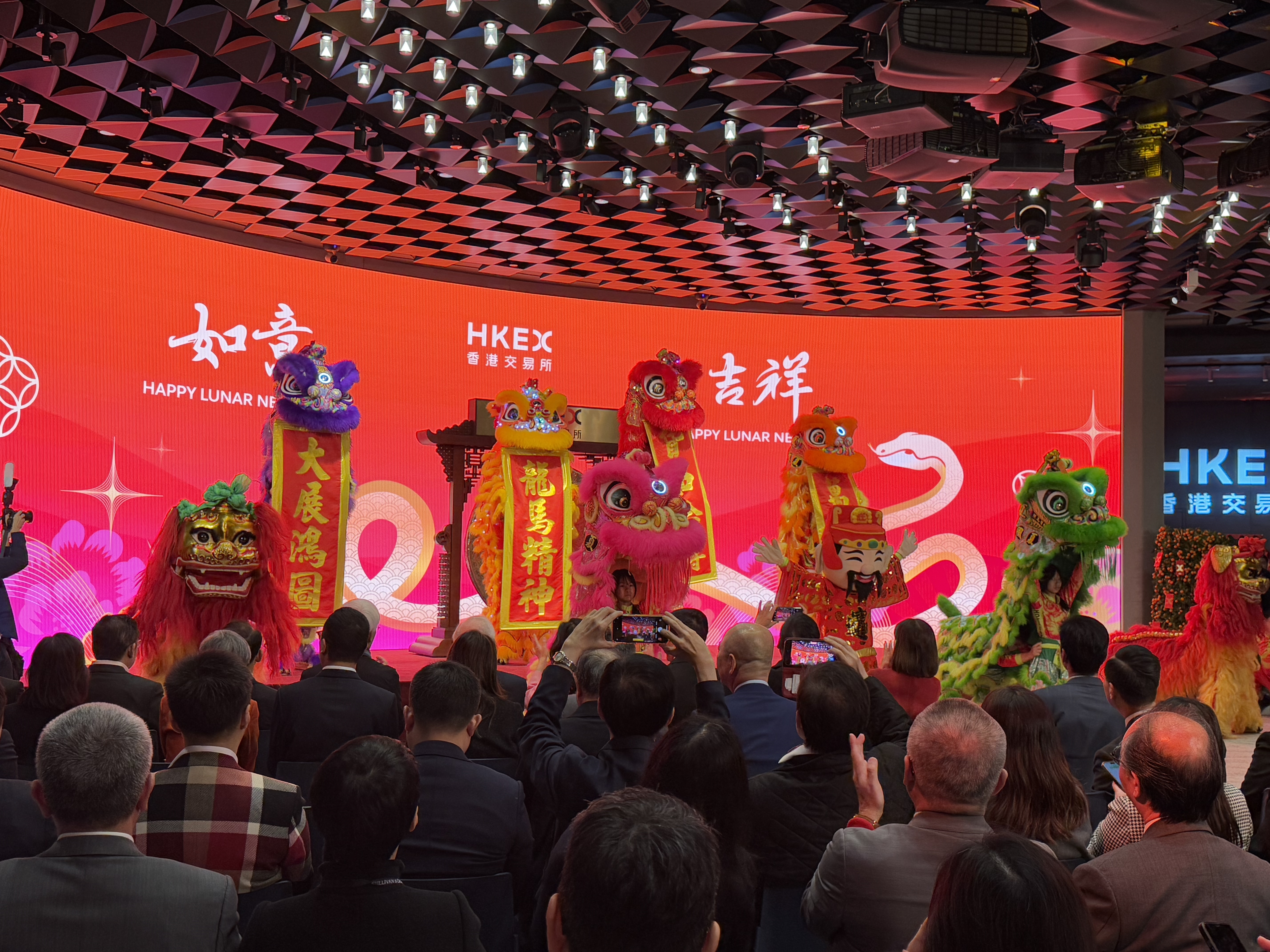 (大公文匯全媒體記者陳子萌報道)今日(3日)大年初六,是香港交易所蛇年開市首日。港交所邀請香港中樂團作開場表演,另有舞獅隊表演,以及「財神」來到現場與嘉賓互動,尤為矚目。