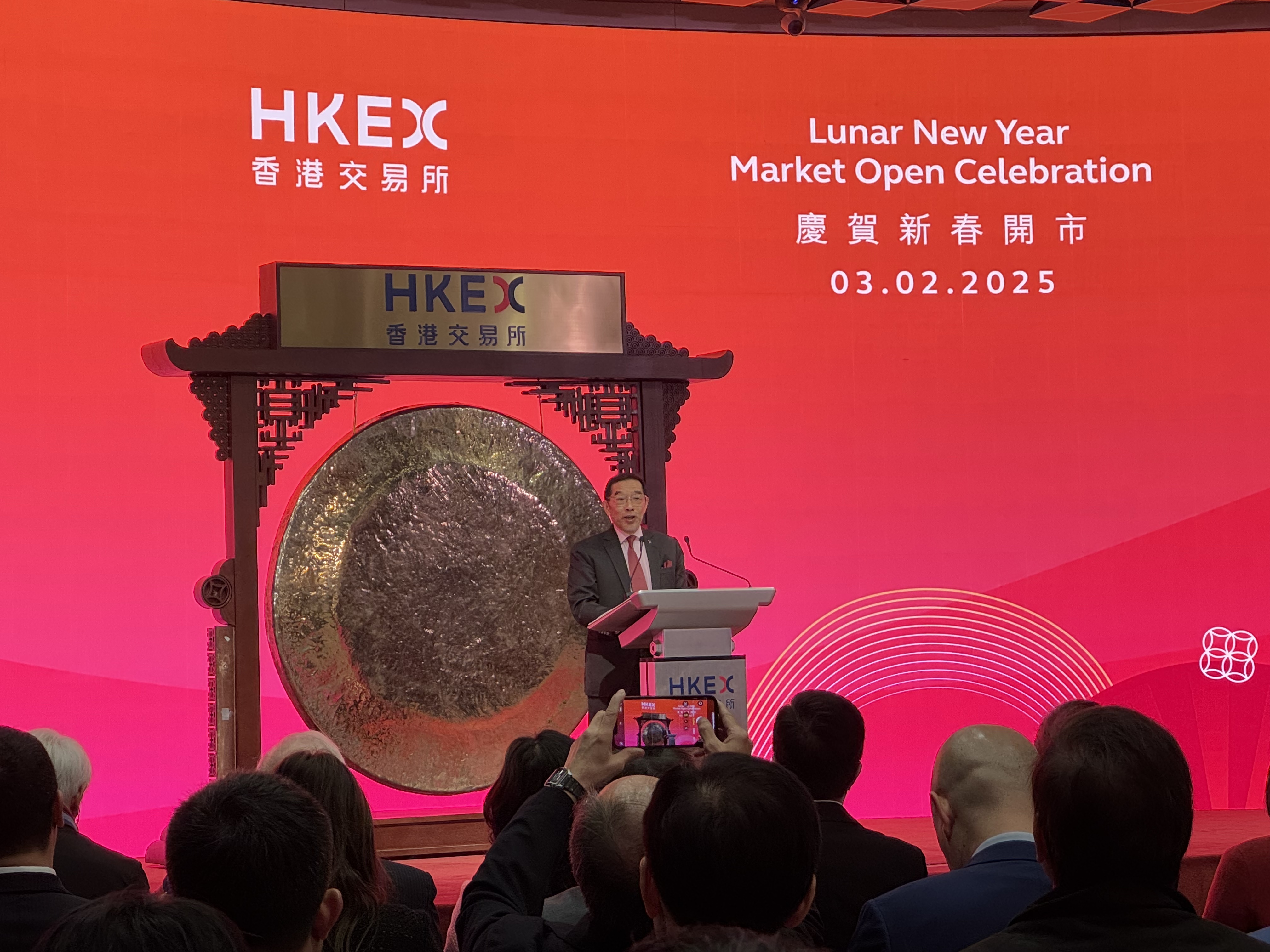 港交所主席唐家成感謝中央以及香港特區政府的支持,指港股在過去表現良好,股票成交創下多個紀錄,未來新的一年也會充滿更多的新機遇,更強調未來會開發更多新產品、新平台,歡迎更多投資者來香港。