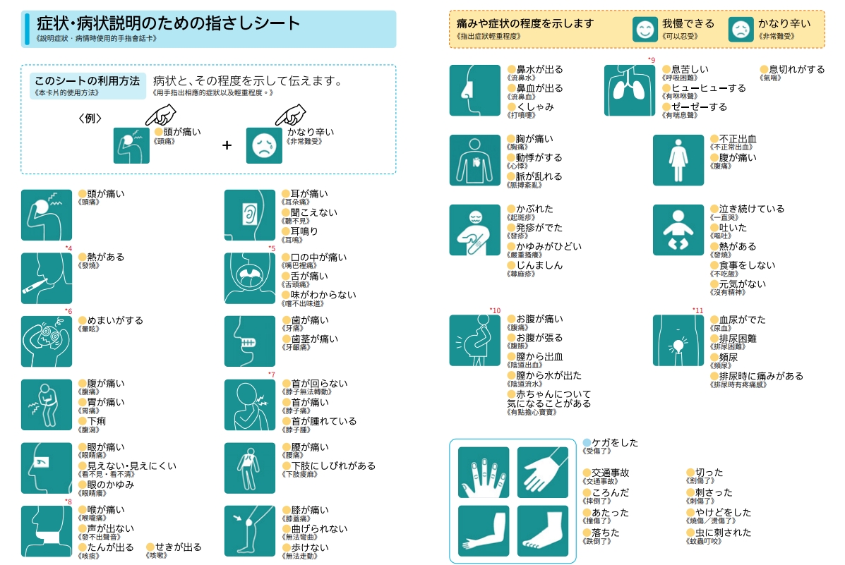 ■ 接受醫師診療時,可以向醫師出示「手指會話卡」說明症狀,官方提供的「手指會話卡」詳列各種常見症狀,如頭痛、發燒、腹痛、腹瀉等,並可以表達嚴重程度,以便患者與醫師溝通。