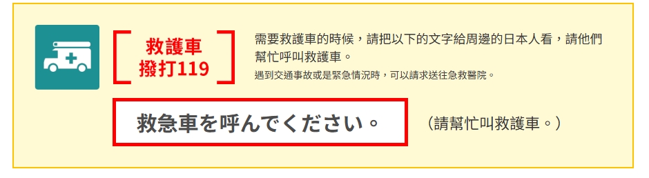 日本國家旅遊局提醒,遇到交通事故或緊急情況時,外國遊客可以在當地撥打熱線「119」召喚救護車。不會日語的旅客,可向周邊的日本人出示「救急車を呼んでください(請幫忙叫救護車)」字句,請他們幫忙呼叫救護車。