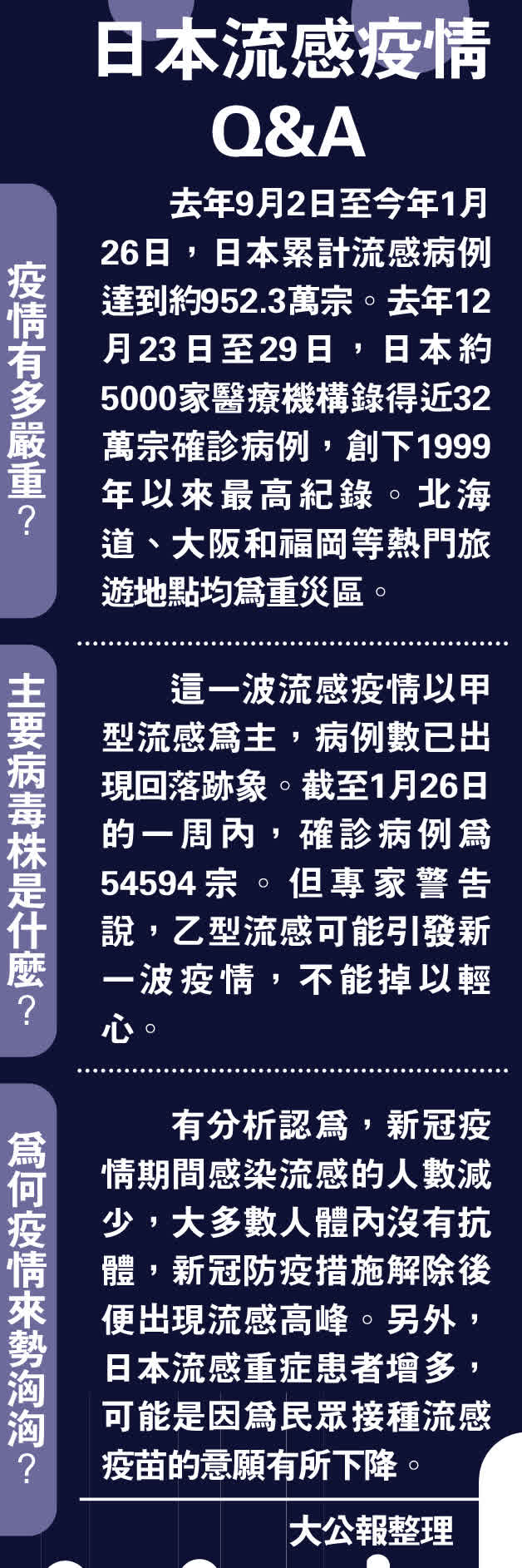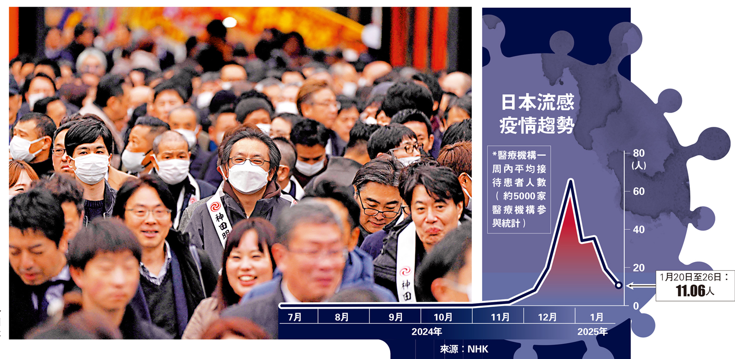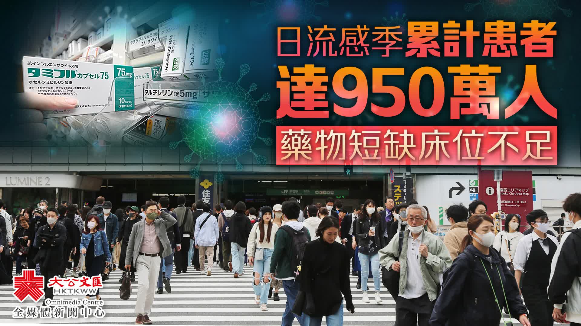 (大公報 記者 鄭文迪、桂茹雲、王可嘉)台灣藝人徐熙媛(大S)遊日期間猝逝,引起各界關注日本流感疫情。最新統計數據顯示,自去年9月2日至今年1月26日累計確診病例已超過950萬宗。香港感染及傳染病醫學會會長林緯遜昨日表示,一名50多歲的患者自日本大阪返港後確診甲型流感和甲型鏈球菌併發肺炎,一度危殆。另外,有準備赴日旅遊的港人對當地流感疫情感到憂慮,有人表示已帶備藥物傍身。