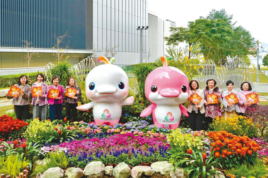 楊何蓓茵在社交平台發文指,她昨日與6位女局長及特首辦主任,手持以「海上國寶」中華白海豚為設計靈感的「喜洋洋」和「樂融融」公仔,一同與一對兩米高的「喜洋洋」和「樂融融」拍照,以行動支持和熱烈期待十五運會和殘特奧會舉行。