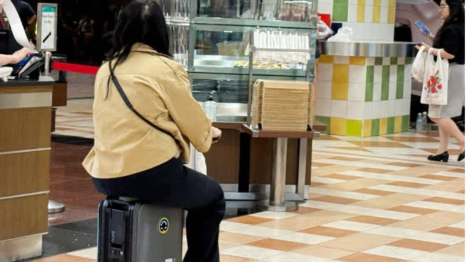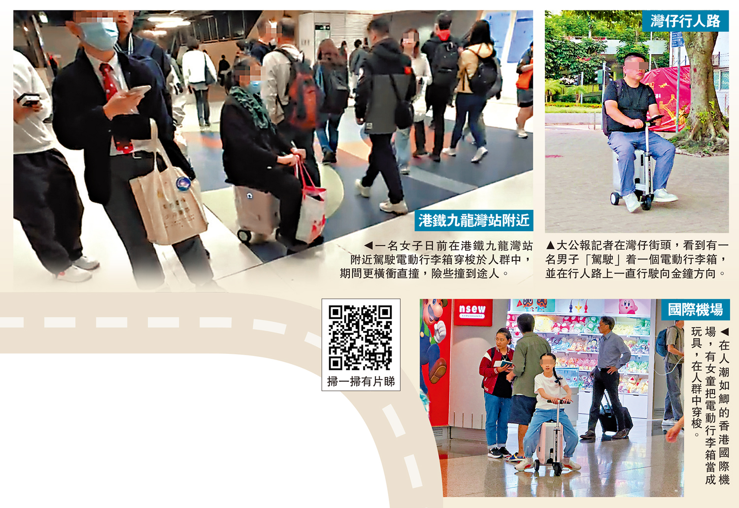 【大公報記者 余風、蘇荣(文) 盧剛昌(圖、攝錄) 融媒組(製作)】假期結束,大批外遊市民返港拖着大大小小的行李箱歸來。近日大公報記者在香港國際機場、高鐵香港西九龍站及公眾的行人道等地方均看見有人坐在電動行李箱上,在大堂及行人路上左穿右插地飛馳。