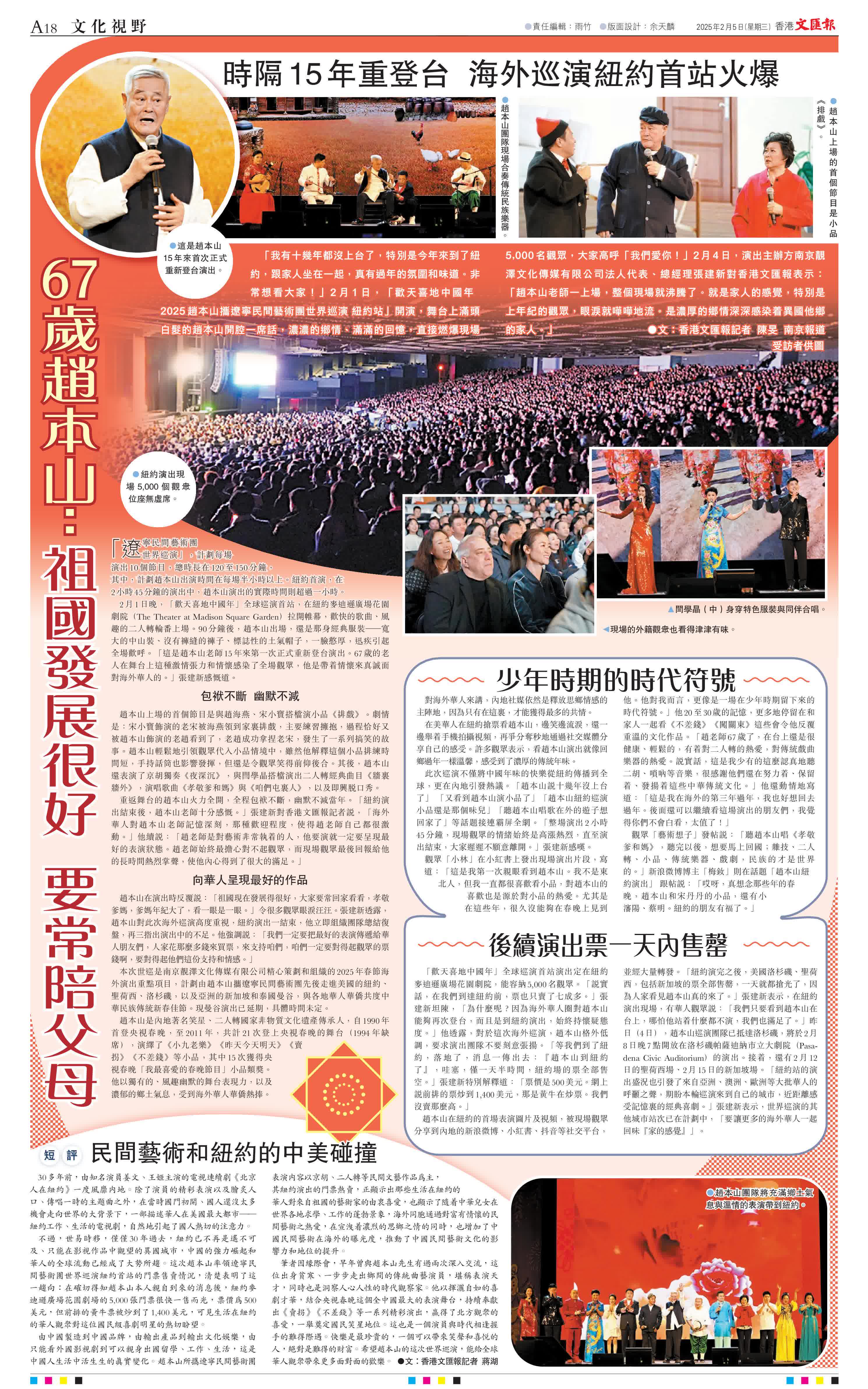 (香港文匯報記者 陳旻 南京報道)「我有十幾年都沒上台了,特別是今年來到了紐約,跟家人坐在一起,真有過年的氛圍和味道。非常想看大家!」2月1日,「歡天喜地中國年 2025趙本山攜遼寧民間藝術團世界巡演 紐約站」開演,舞台上滿頭白髮的趙本山開腔一席話,濃濃的鄉情、滿滿的回憶,直接燃爆現場5,000名觀眾,大家高呼「我們愛你!」