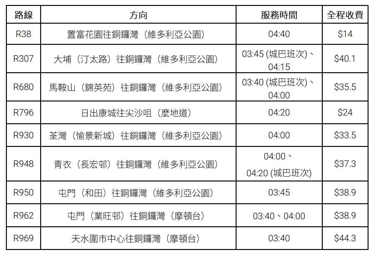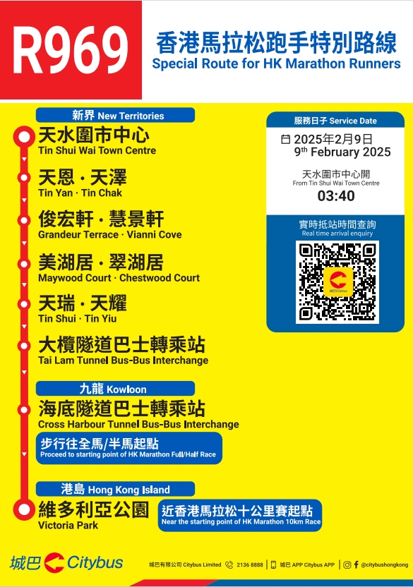 因應賽事當日的臨時封路及改道安排,城巴多條路線將會改道行駛及/或臨時遷移巴士站,城巴將因應實際情況調整服務,請顧客預留額外乘車時間。顧客如要查詢個別路線的改道詳情及臨時巴士站安排,可使用城巴手機應用程式直接輸入巴士路線查詢。顧客亦請留意張貼於巴士站的通告及現場警方指示。