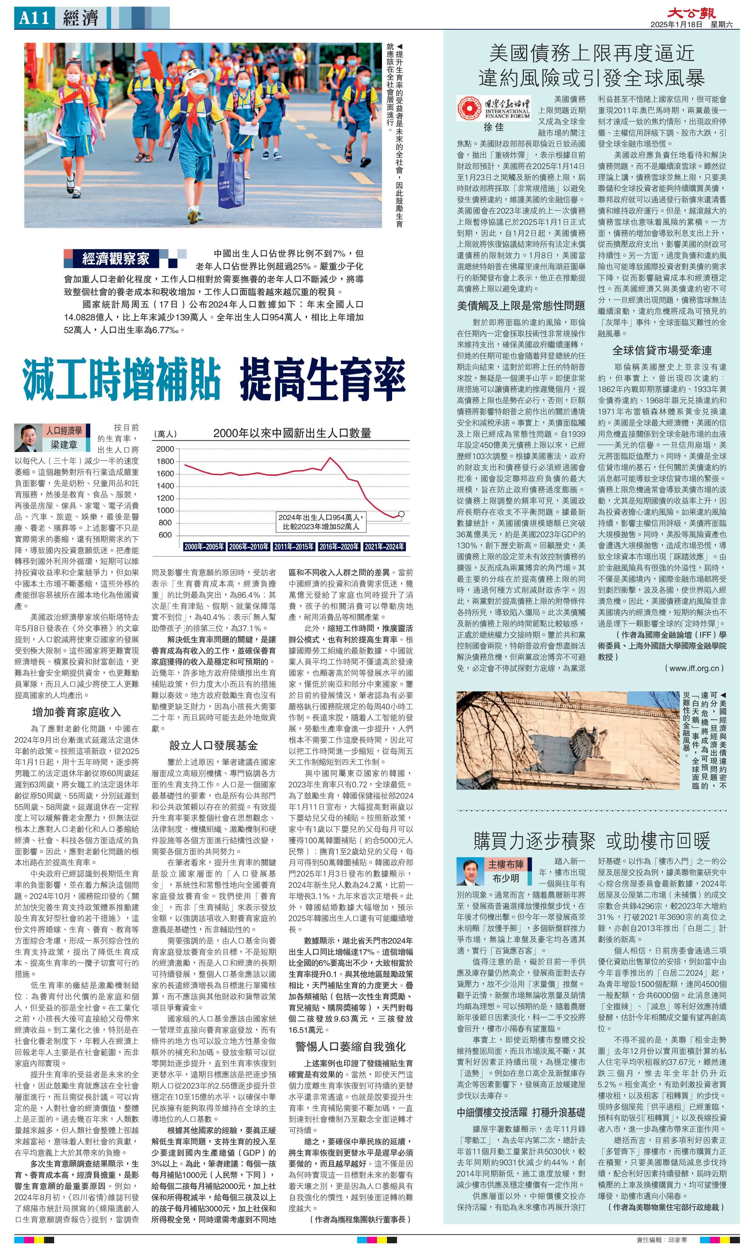 美國債務上限問題近期又成為全球金融市場的關注焦點。美國財政部部長耶倫近日致函國會,拋出「重磅炸彈」,表示根據目前財政部預計,美國在2025年1月14日至1月23日之間觸及新的債務上限,屆時財政部將採取「非常規措施」以避免發生債務違約,維護美國的金融信譽。美國國會在2023年達成的上一次債務上限暫停協議已於2025年1月1日正式到期,因此,自1月2日起,美國債務上限就將恢復協議結束時所有法定未償還債務的限制效力。1月8日,美國當選總統特朗普在佛羅里達州海湖莊園舉行的新聞發布會上表示,他正在推動提高債務上限以避免違約。