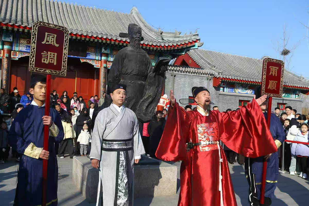 2024年春節,在第一屆了凡公園新春文化廟會上,寶坻區首創推出了「了凡賜福巡遊」沉浸式互動演出。巡遊中,歷史名人被賦予了鮮活新潮的形象。身着古裝的「知縣了凡」,帶領數名隨從、學生,沿路祈福「風調雨順、國泰民安」,不時為小朋友送上「狀元鉛筆」「狀元糖果」等文創禮品和茁壯成長、金榜題名等激勵祝福,伴着萌萌噠的笑容讓人如沐春風。