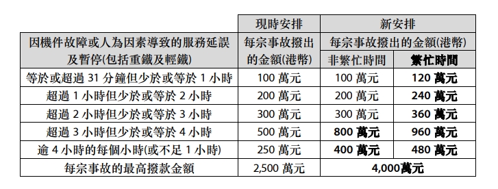 根據2023年經優化的「服務表現回贈」,每當發生在繁忙時間延誤超過3小時的事故,港鐵須罰960萬港元,之後每一小時480萬元,每宗事故的最高罰款金額為4000萬元;當「服務表現回贈」賬戶每累積滿2500萬元,港鐵會安排於特定星期六或星期日推出一天「特別車費日」,讓乘客半價乘車。