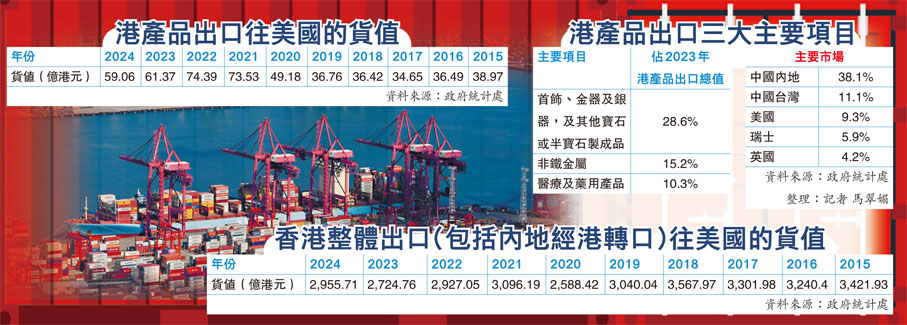 貿發局數據顯示,2023年香港在美國市場的貿易加權平均關稅稅率只有1.4%,如額外徵收10%關稅,稅率將達到11.4%。中國的稅率則會由10.5%升至20.5%。大幅上升主因之一是內地主要產品,例如智能手機、筆記型電腦或遊戲機不涉及任何常規關稅或第301條關稅。