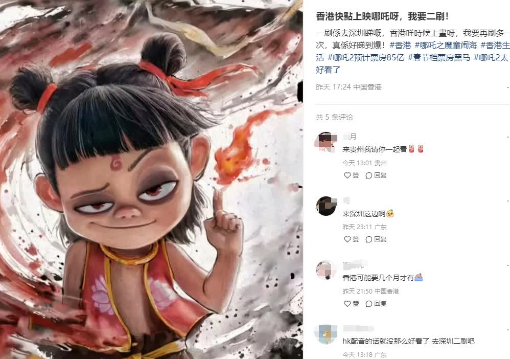 香港網友已經迫不及待,北上深圳睇《哪吒2》。不少香港網友在社交媒體上發問:香港什麼時候上映《哪吒2》?
