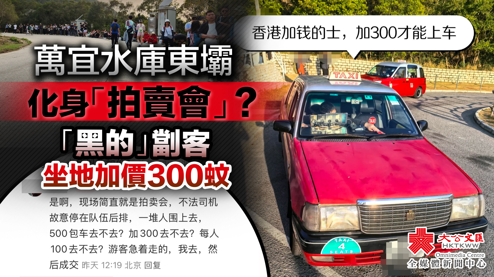事實上,這種現象已經存在很久,且不僅發生在東壩地區。去年大公文匯全媒體記者進行現場實測,東壩到北潭涌大約10公里的路程,有「黑的」叫價450元,亦有「黑的」一車拚5人,每人收60元,即從東壩到北潭涌要收費300元;還有「黑的」表示可以按咪錶收費,但要加價50元。有網友亦分享,自己在香港太平山頂也曾被坑,當時搭乘的士到山下司機竟收400元。
