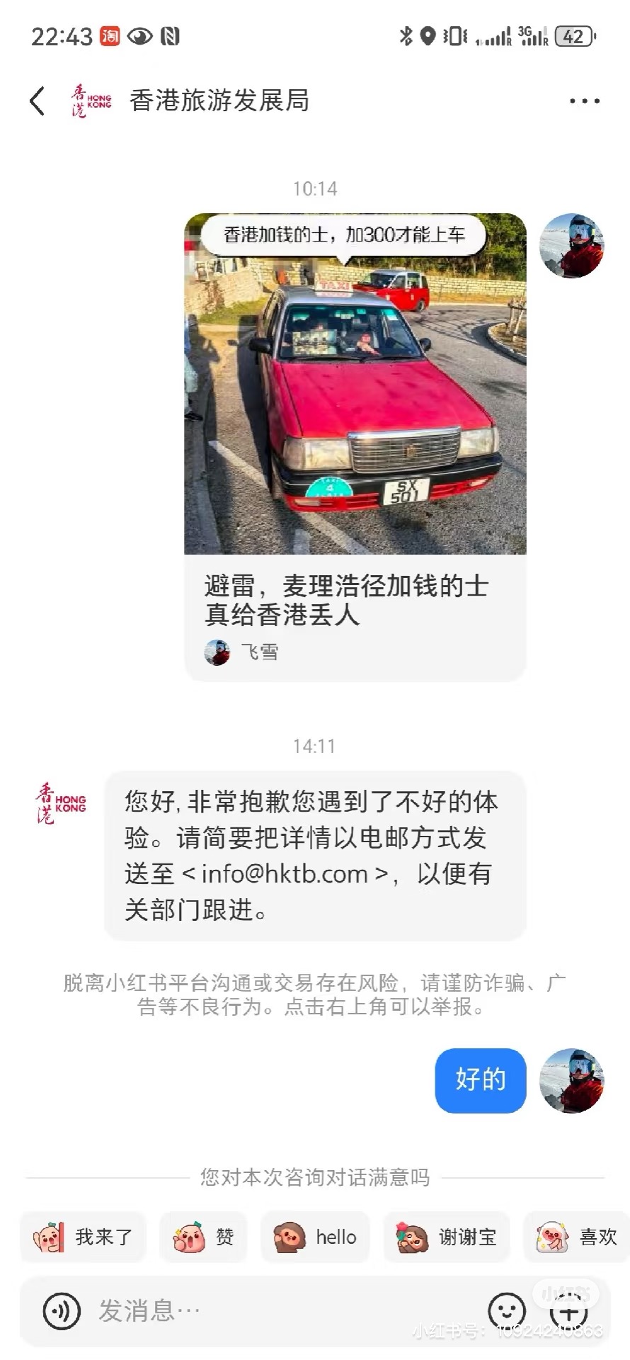 網友現場束手無策,有遊客不願屈服選擇打電話報警投訴,警方來到現場表示,當事人需要回去錄口供,問及是否有線上投訴渠道,警方給予否定回答。遊客來港本該享受旅遊,花費大量時間解決此類事件實屬影響體驗。但好在警方來到現場後,後方的士都開始按照規則落旗,網友亦順利回到酒店。警方稱,遇到此類情況,即時遊客現場同意加價,到了目的地也可以選擇不給司機額外的錢。網友後來又在小紅書上聯繫香港旅遊發展局,官方回覆稱將跟進事件。