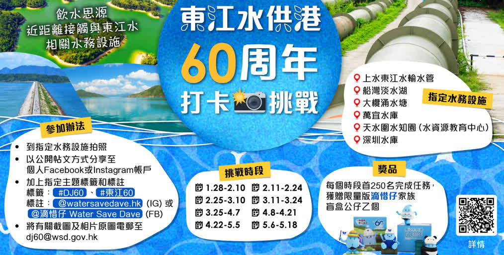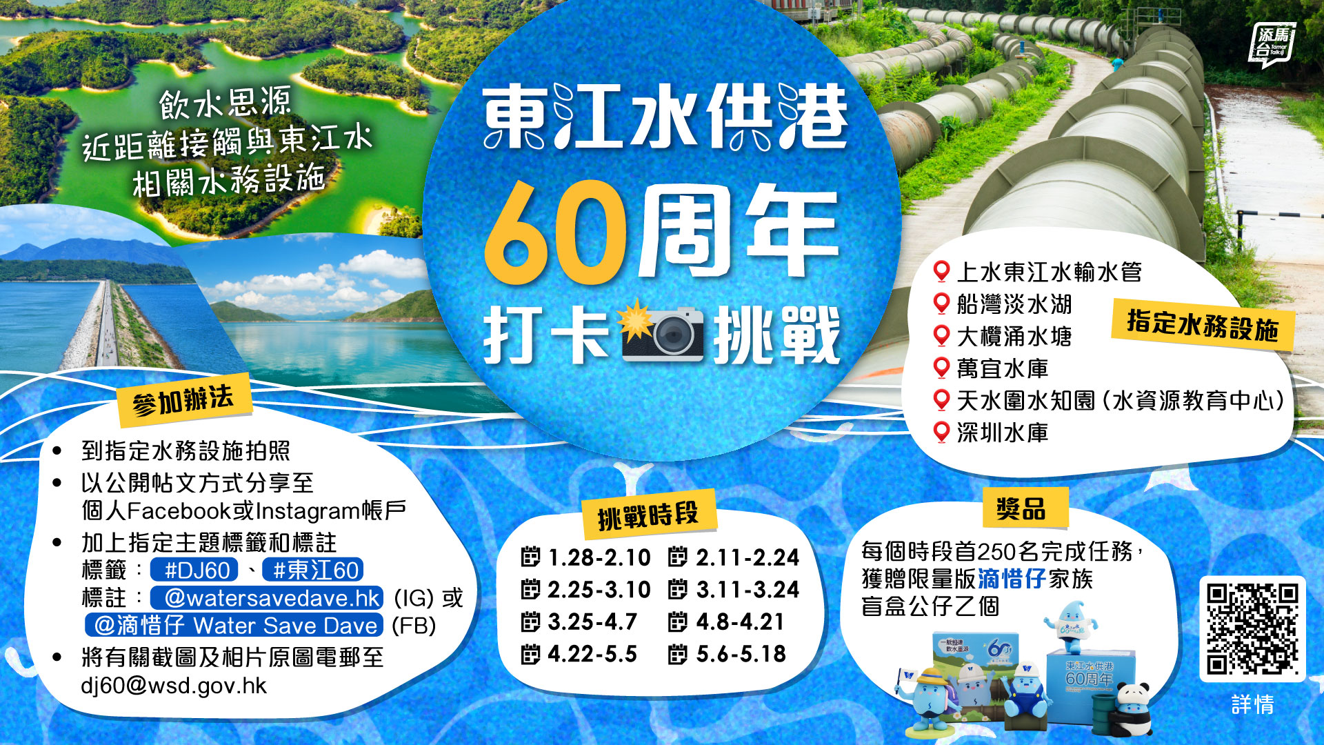 為與民同賀東江水供港60周年這個里程碑,「東江水供港60周年打卡挑戰」活動正在舉行,藉此鼓勵大家近距離接觸多個與東江水相關的水務設施,提升對東江水輸送系統的認識。