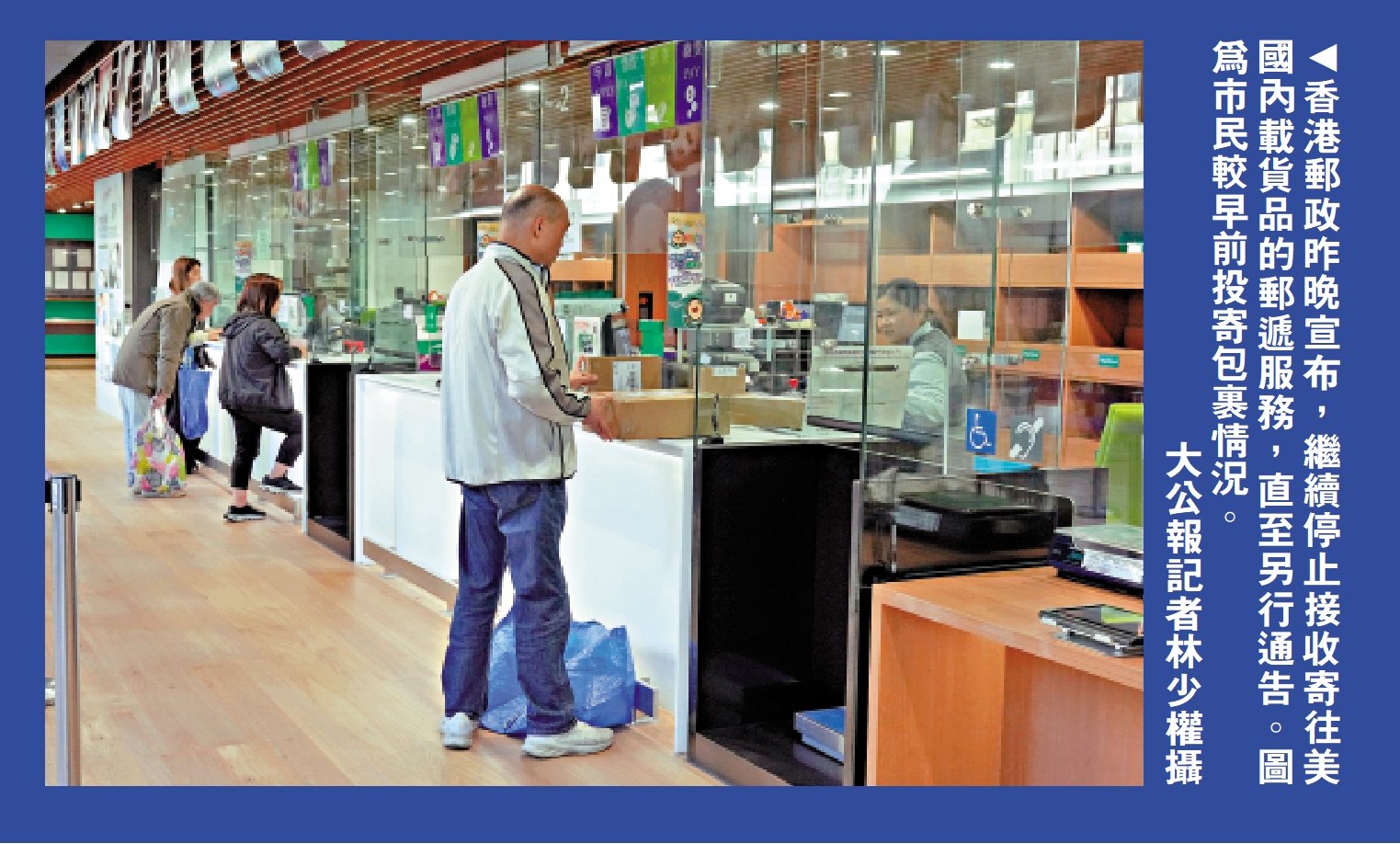 (大公報 記者 鄭文迪)美國前日曾一度停止接收從中國內地及香港寄出的包裹,但不足12小時改口,安排混亂。美國並宣布對中國貨物加徵關稅,更表明措施同時適用於香港。對此,香港郵政昨晚宣布,繼續停止接收寄往美國內載貨品的郵遞服務,直至另行通告。
