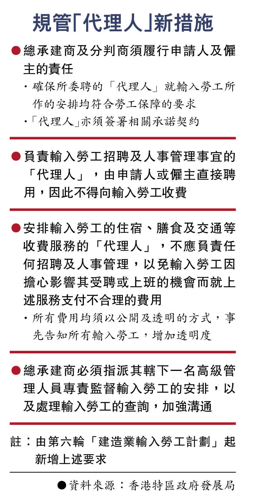 (香港文匯報 記者 聶曉輝)香港文匯報去年多次揭發有建造業外勞遭所謂的「管理公司」、「代理人」剝削,備受香港社會各界關注。特區政府發展局昨日公布新措施,由第六輪獲批的申請開始新增4項要求,表明有關的「代理人」必須遵守保障勞工的要求,釐清申請人及僱主的責任,包括代理人不負責任何招聘及人事管理,必須由申請人或僱主直接聘用且不得向外勞收費。香港建造業總工會歡迎新措施,認為對保障工人有積極作用,但同時指中介與管理公司的招數層出不窮,促請特區政府做好把關工作。