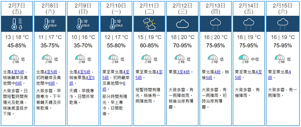 天文台表示,受強烈冬季季候風影響,周末期間本港天氣轉冷,賽事當日早上市區最低氣溫可能降至10至11度水平,有機會接近入冬以來的最低紀錄。此外,當日日間非常乾燥,相對濕度介乎35至70%。