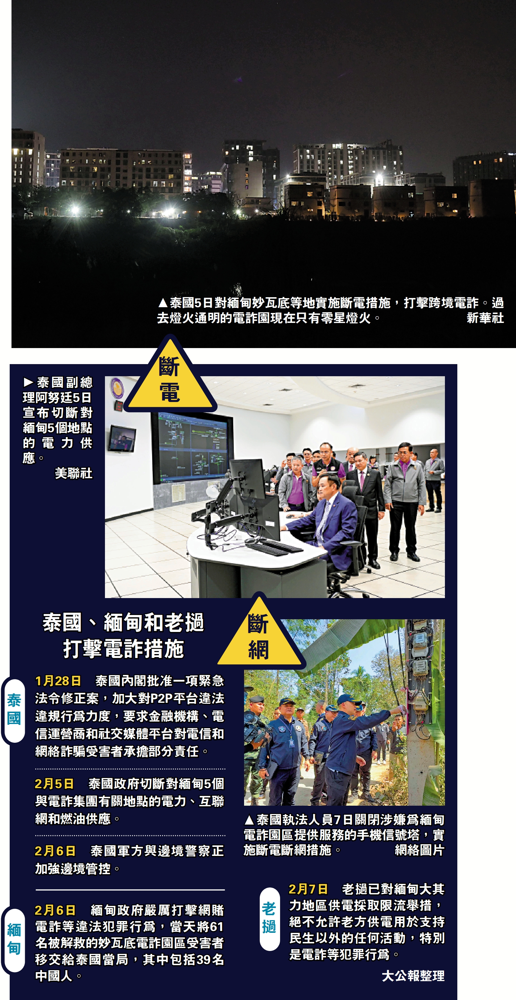 泰國政府5日起切斷對緬甸5個地點的電力互聯網和燃油供應。這5個地點位於泰緬邊境的緬甸境內,覆蓋大其力、妙瓦底等與電信詐騙集團有關的地區。泰國副總理兼國防部長普坦·威差耶猜6日主持會議,進一步部署打擊邊境毒品及犯罪活動的行動。他表示,目前,包括國家廣播電視和電信委員會、地方電力局等在內的政府機構正密切合作,全面推進相關措施。同時,泰軍方與邊境警察正加強邊境管控。