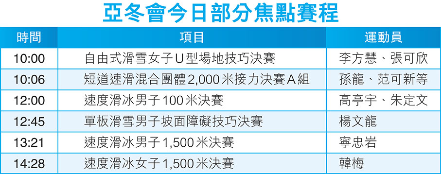 亞冬會短道速滑昨日展開角逐,國家隊於混合團體2,000米接力項目盡顯強隊風範,先於半準決賽由范可新、張楚桐、孫龍和劉少林攜手晉級,到準決賽調整陣容以范可新、王欣然、林孝埈及劉少林出戰,以2分40秒241的成績闖進決賽A組,將於今日上午10時06分與韓國、日本及哈薩克斯坦爭金。根據賽程,該項目很有機會誕生今屆亞冬會的首面金牌。