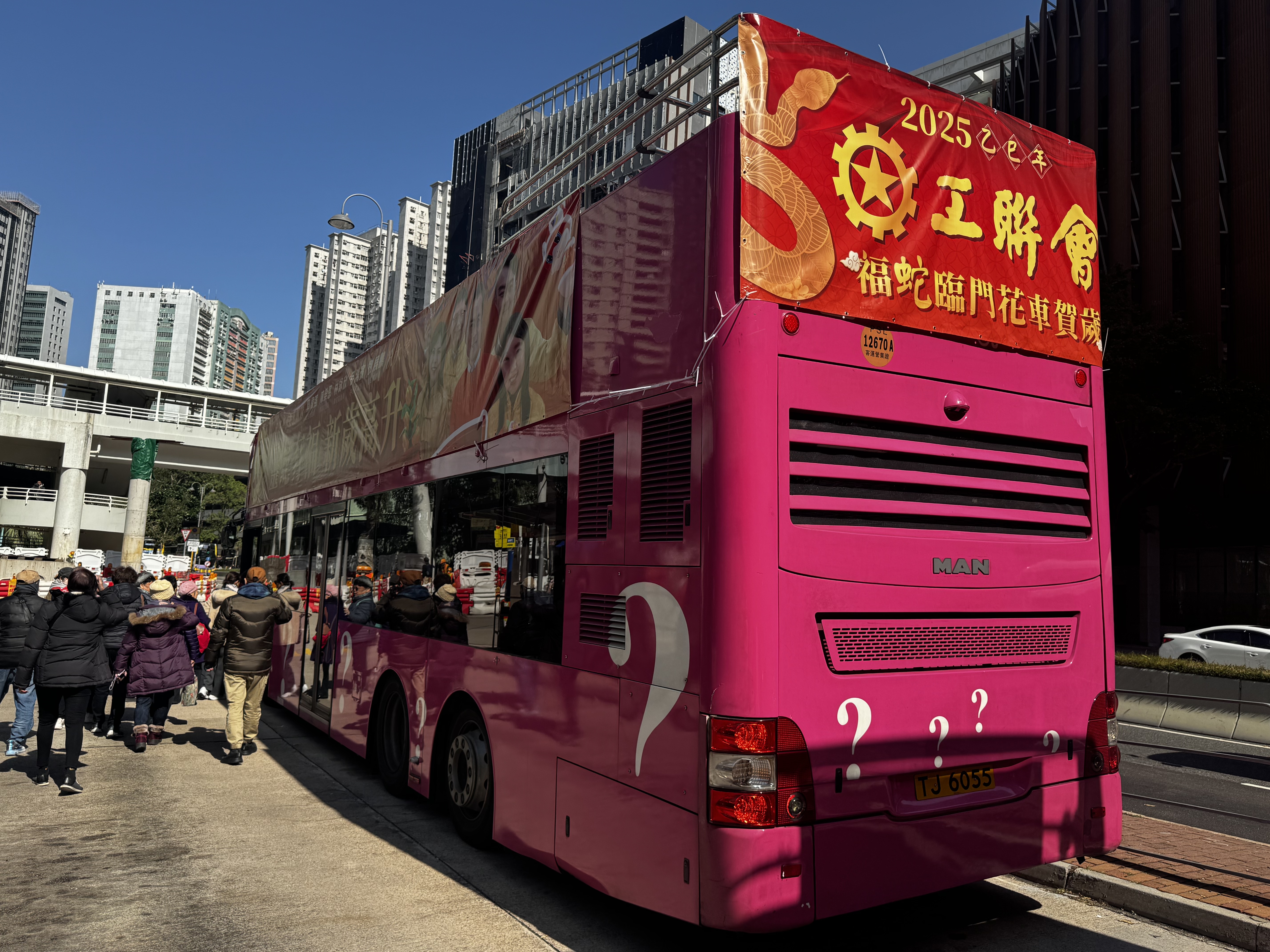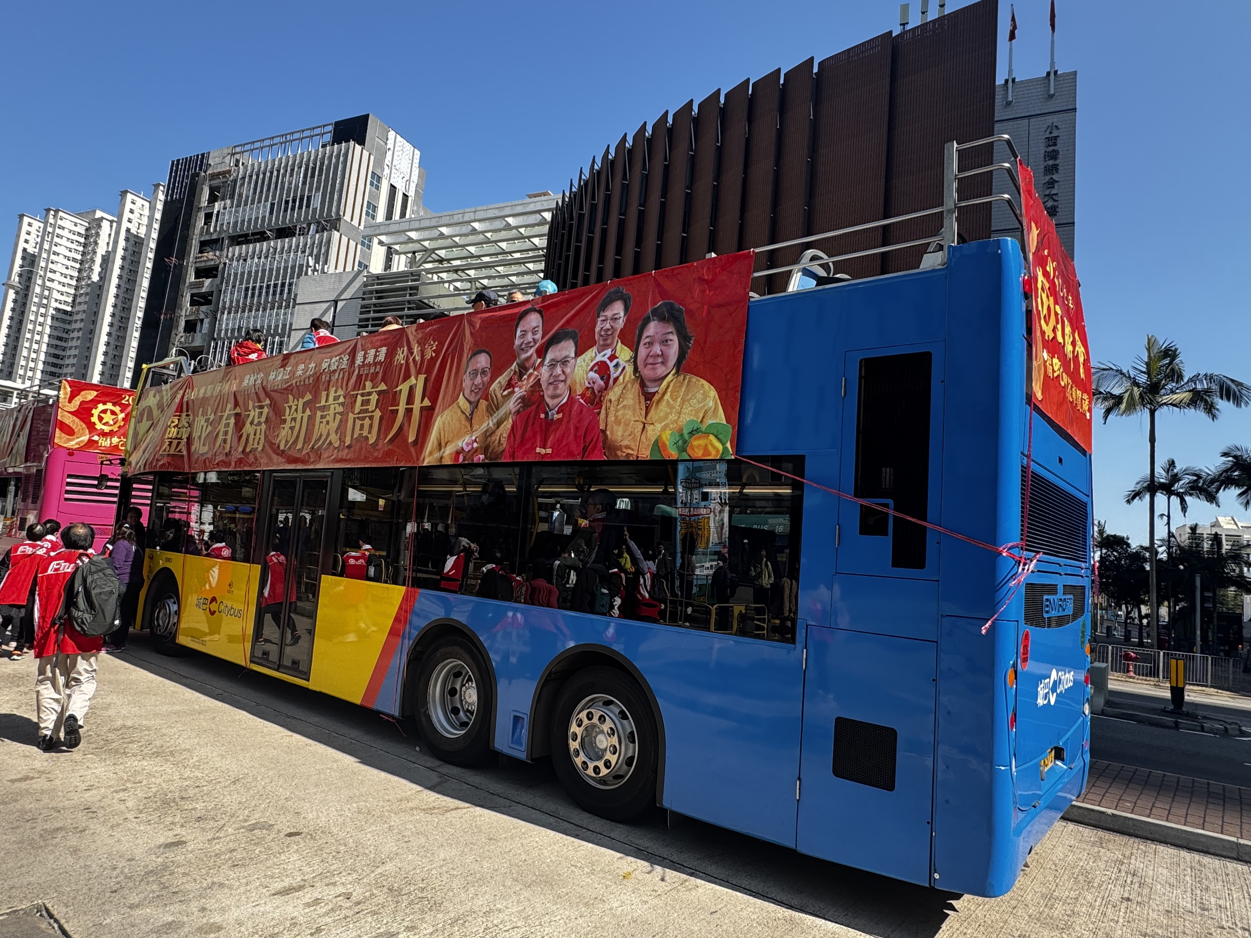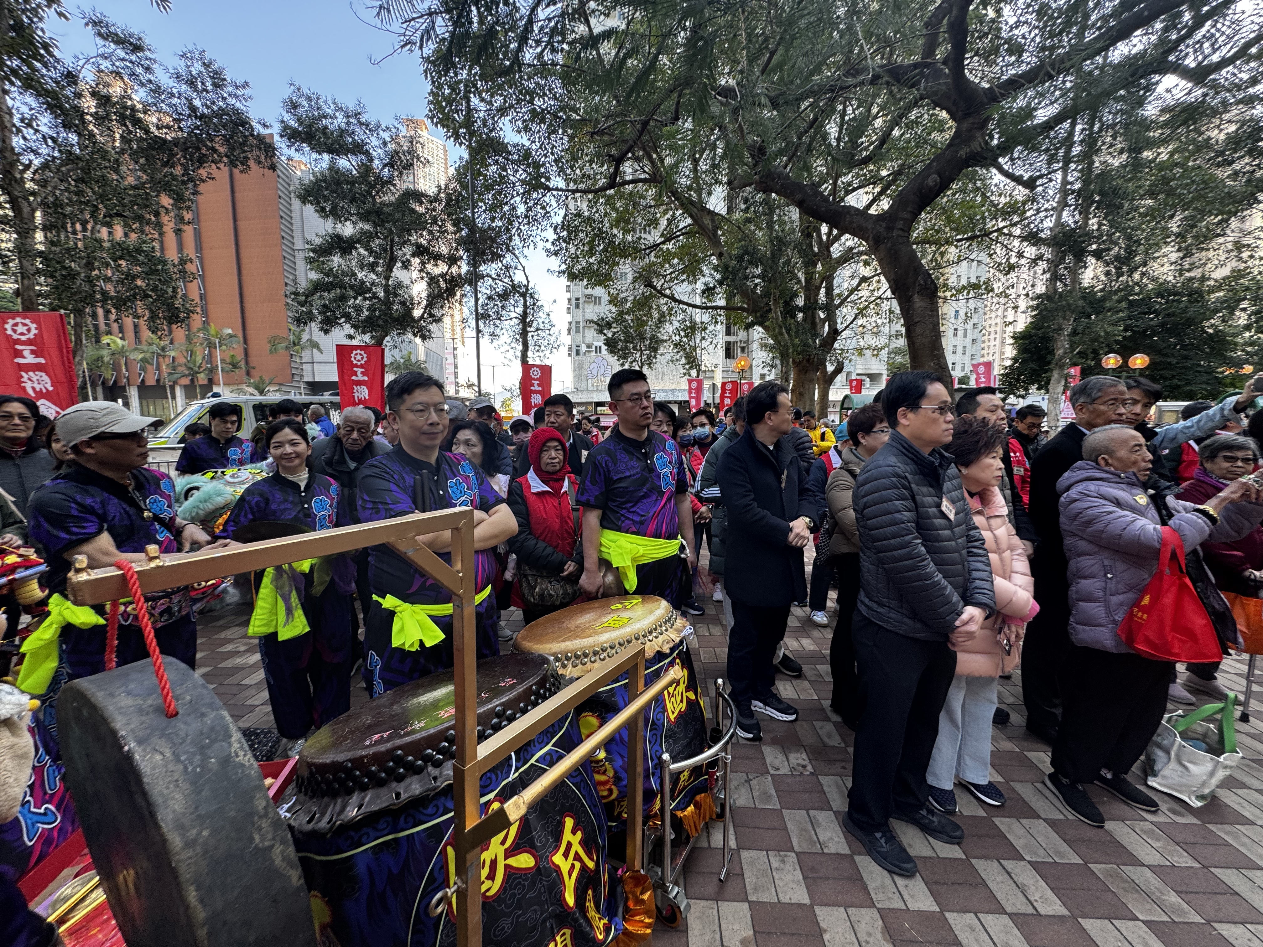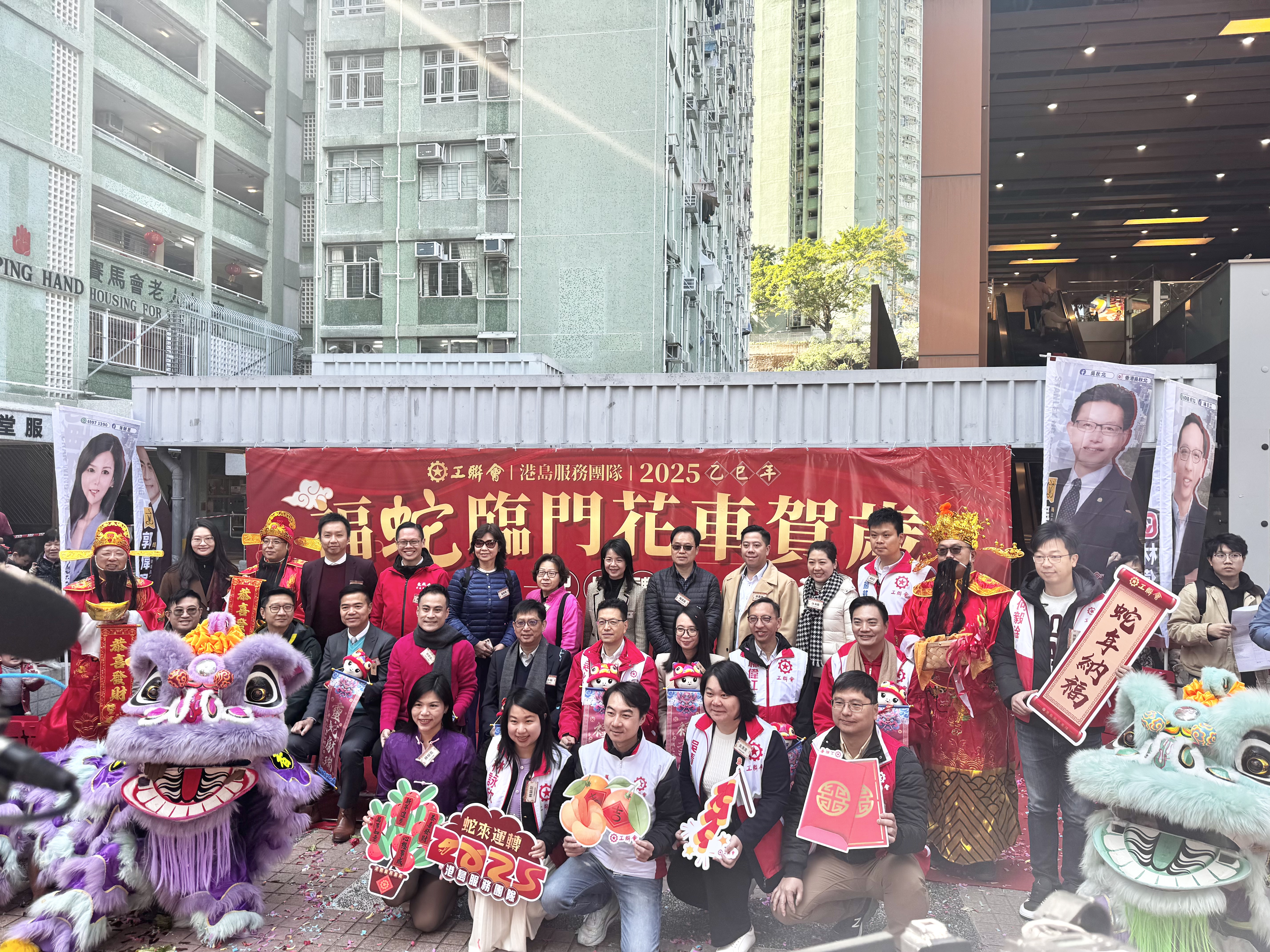 隨後,港島區的一眾工聯會區議員向街坊市民拜年。隨着花車的緩緩前行,鑼鼓喧天,市民們紛紛拿出手機記錄下這難忘的一刻。