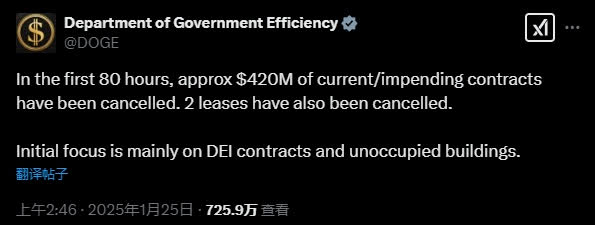 政府效率部此前在社交平台發文稱,運作的前80小時內,成功取消了超過4.2億美元的政府合約以及2份租約。