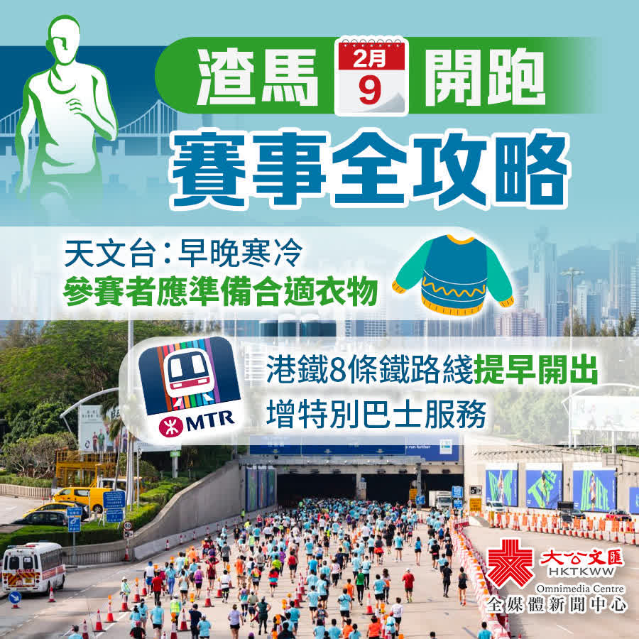 因應賽事舉行,港鐵8條鐵路綫的頭班車會提早開出,港鐵屯馬綫及東鐵綫提早於清晨3時25分開出,其他路綫會在清晨4時至4時半開出。此外,28條特別巴士路線將於明日提供服務,方便參賽人士前往尖沙咀或銅鑼灣。