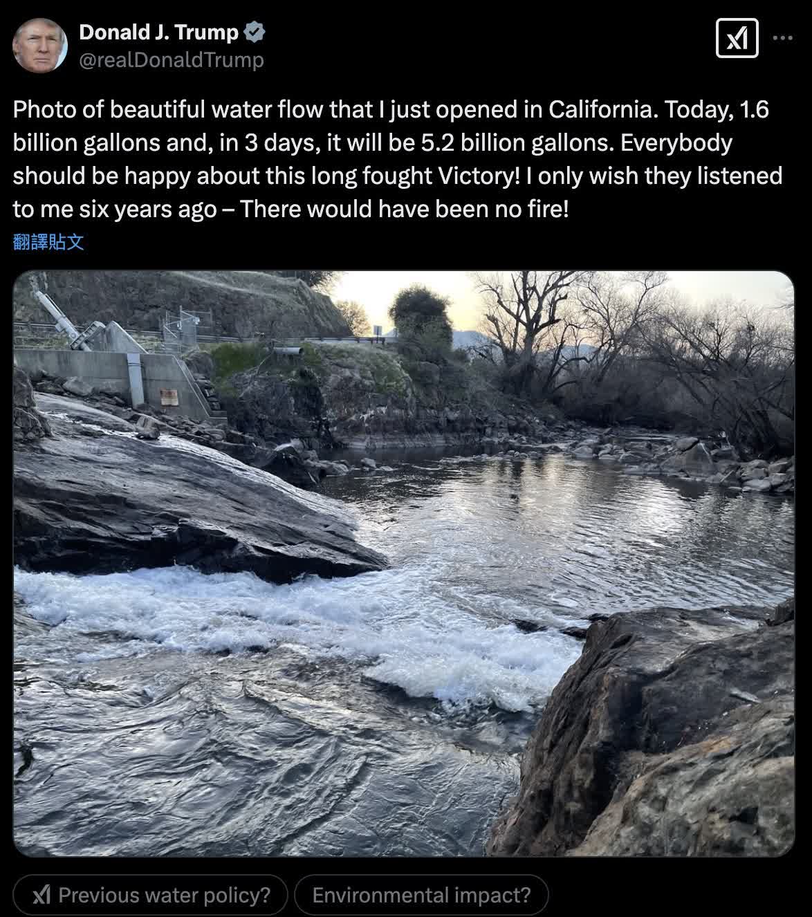 專家們還對農業的影響提出了更多擔憂。加州水資源政策組織太平洋研究所的研究主任希瑟·庫利表示,卡威亞湖和成功湖儲存的水對於夏季灌溉農田至關重要。她指出,特朗普的決定「沒有任何好處,而且使加州農民在未來幾個月面臨供水受限的風險。」