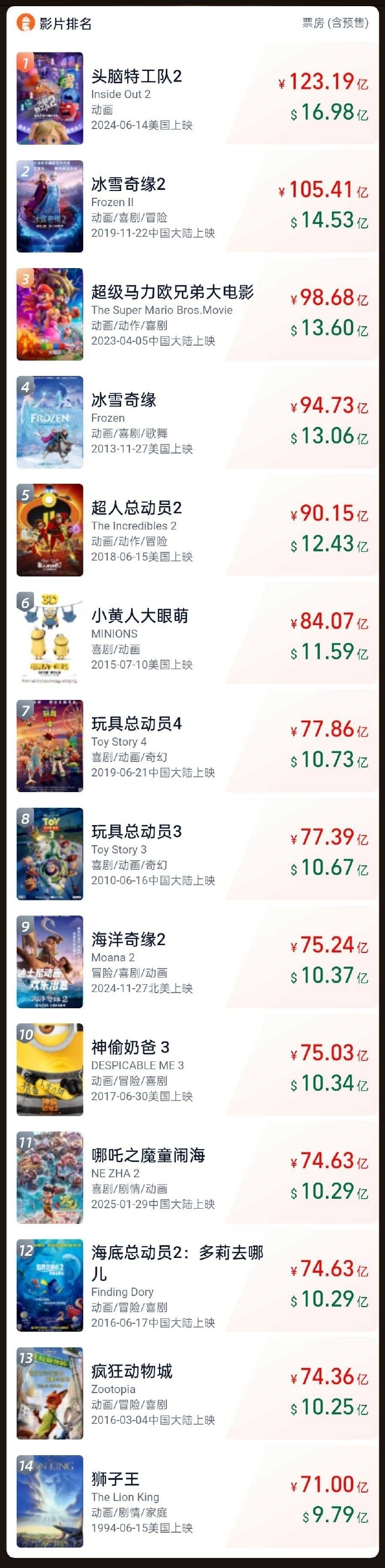 截至2月8日,影片《哪吒之魔童鬧海》票房(含預售)突破70億,成為全球影史第63部票房超過70億(人民幣)的影片,打破70億(人民幣)票房俱樂部好萊塢影片壟斷。