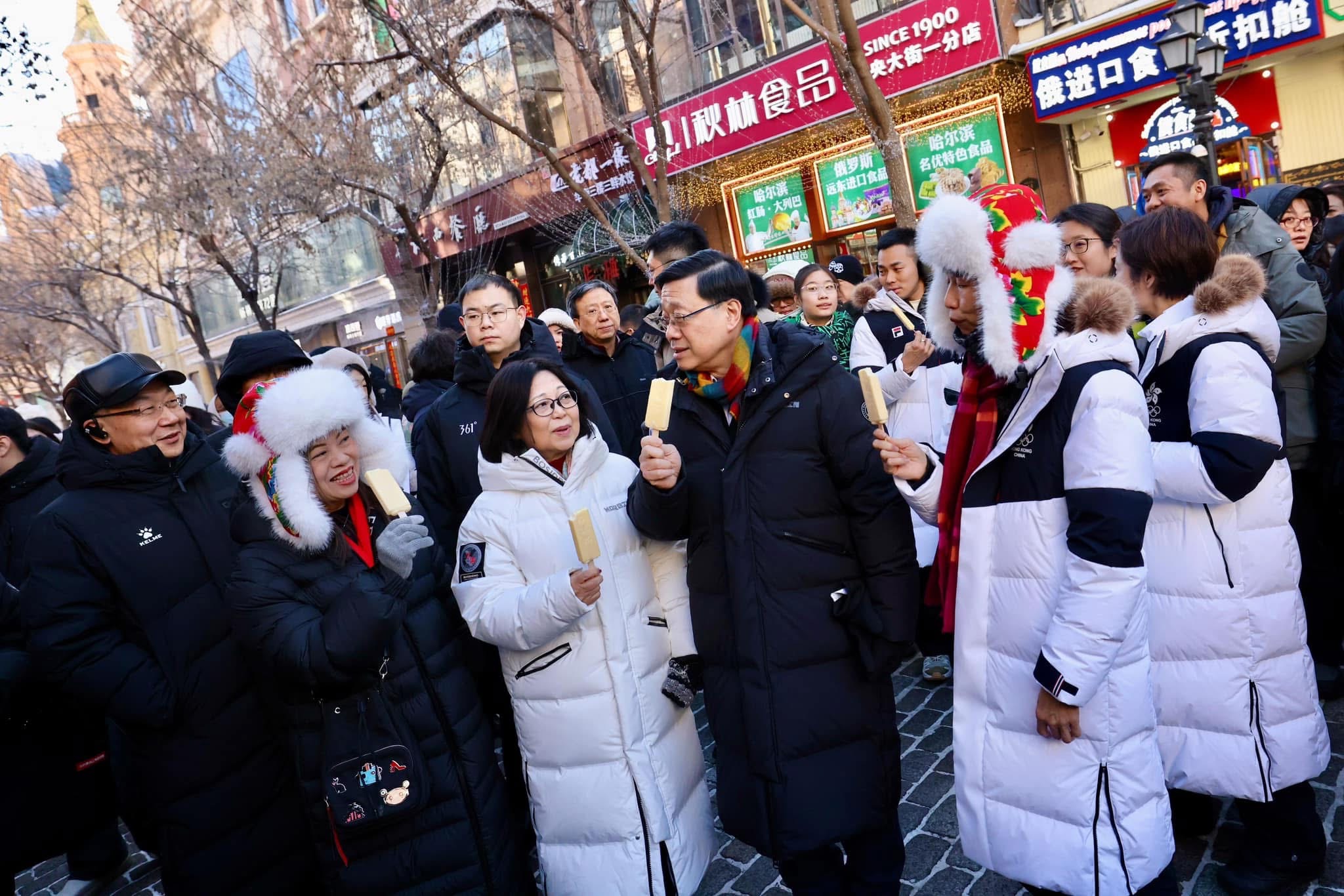 李家超表示,自己趁賽前空擋參觀了被譽為「亞洲第一街」、擁有125年歷史的哈爾濱中央大街,步行街特設亞冬會主題旗艦店,結合賽事IP與在地文化,提升訪客體驗,更指與太太在嚴寒下品嘗哈爾濱特色馬迭爾冰棍及煙囪麵包,感受冰城魅力。