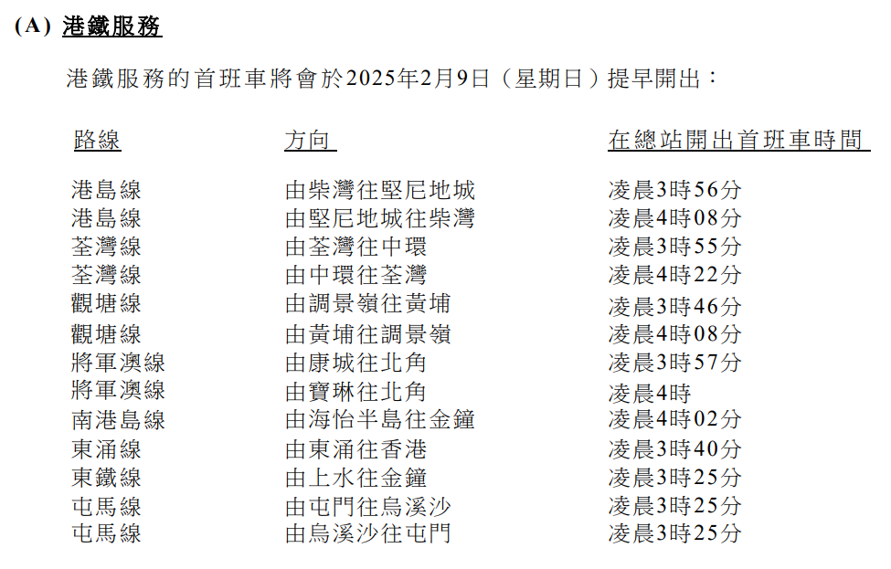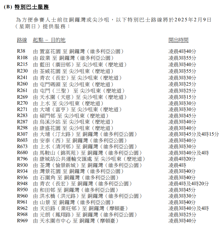 交通方面,比賽當日部分路段將封路;為方便跑手到達賽事起點,港鐵首班車將於比賽當日提早開出;多條特別巴士路線將方便參賽人士前往銅鑼灣或尖沙咀。詳情如下: