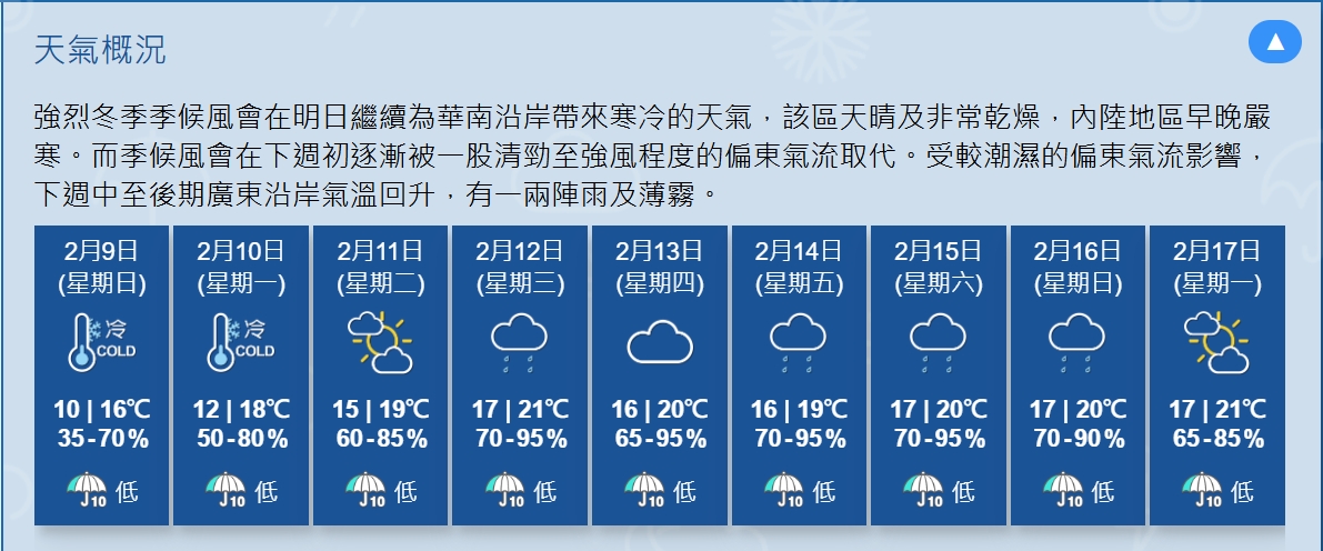 天文台表示,受強烈冬季季候風影響,周末期間本港天氣轉冷,賽事當日早上市區最低氣溫可能降至10度水平,有機會是入冬以來的最低紀錄。此外,今日日間非常乾燥,相對濕度介乎35至70%。