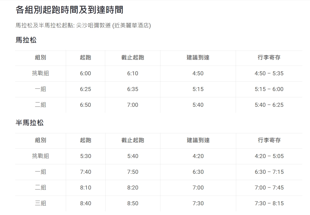 渣馬比賽,全馬及半馬的起點都在尖沙咀彌敦道(近美麗華酒店),快來看各組別的起跑時間及建議到達時間!