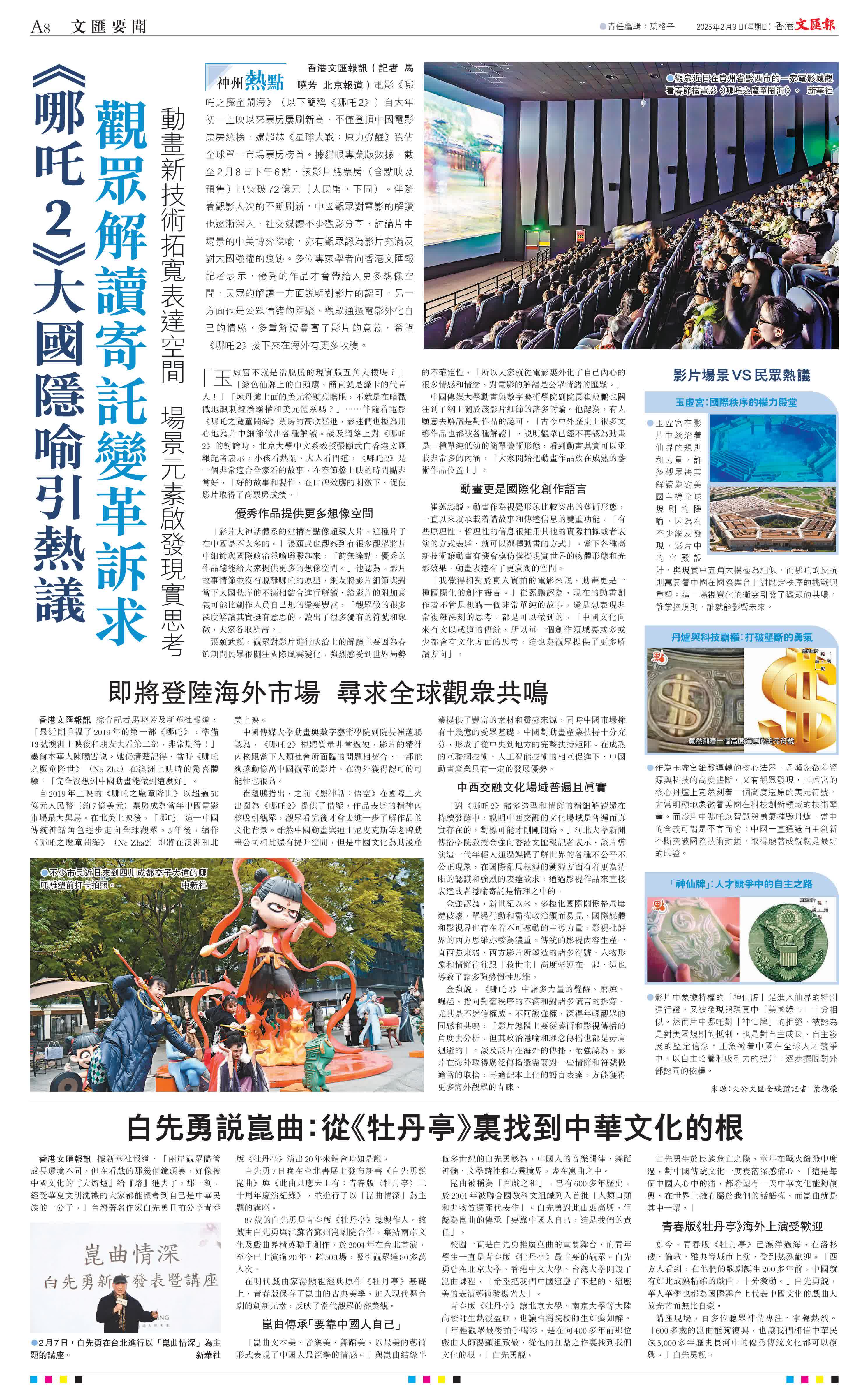 「玉虛宮不就是活脫脫的現實版五角大樓嗎?」「綠色仙牌上的白頭鷹,簡直就是綠卡的代言人!」「煉丹爐上面的美元符號亮瞎眼,不就是在暗戳戳地諷刺經濟霸權和美元體系嗎?」……伴隨着電影《哪吒之魔童鬧海》票房的高歌猛進,影迷們也極為用心地為片中細節做出各種解讀。談及網絡上對《哪吒2》的討論時,北京大學中文系教授張頤武向香港文匯報記者表示,小孩看熱鬧、大人看門道,《哪吒2》是一個非常適合全家看的故事,在春節檔上映的時間點非常好,「好的故事和製作,在口碑效應的刺激下,促使影片取得了高票房成績。」