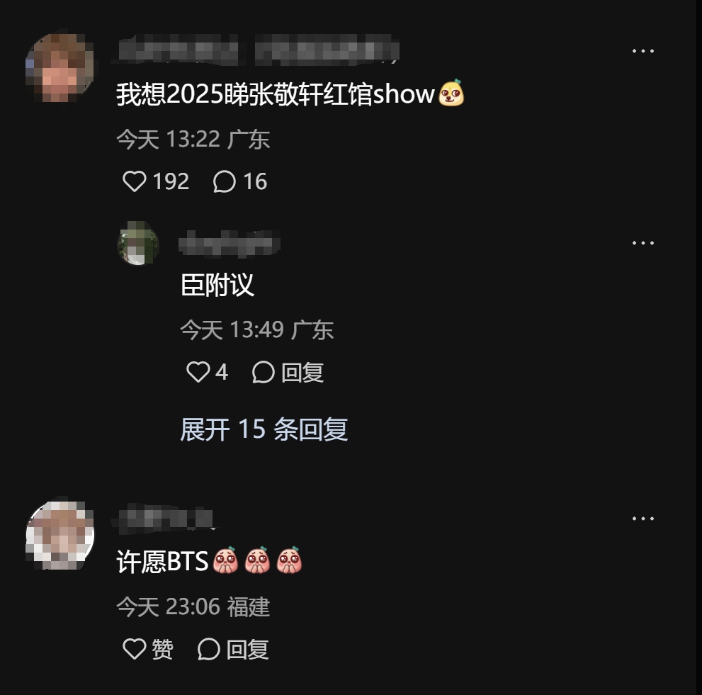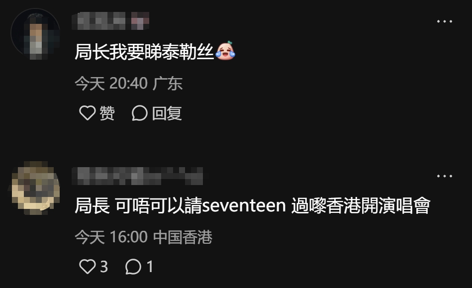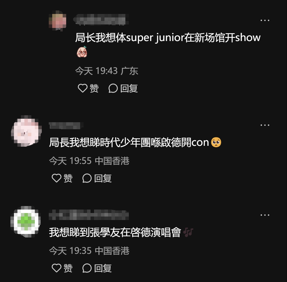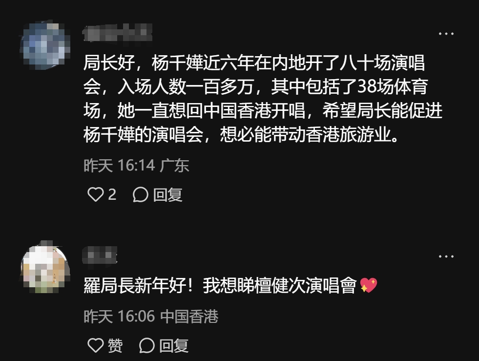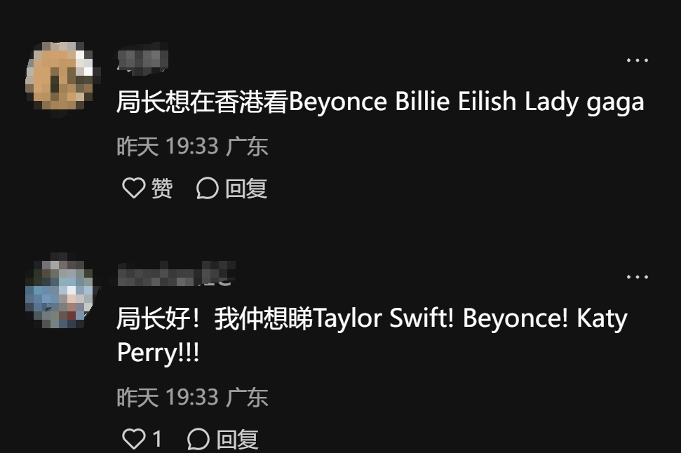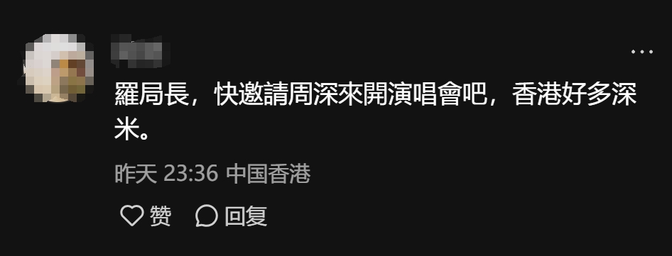 不少網民將羅淑佩賬號的評論區當作「許願牆」,希望局長邀請更多明星來港演出,例如Taylor Swift、BTS、周深等。還有網民緊跟潮流,詢問局長會否引進現時內地爆紅的、登頂中國影史票房第一的《哪吒2》,希望早日在香港看到這部動畫電影。