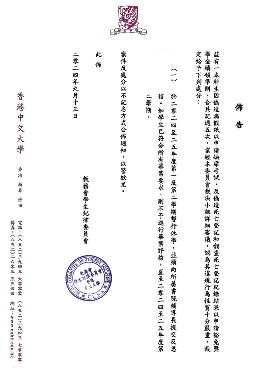 (香港文匯報 記者 姬文風)社交平台近日流傳一張香港中文大學教務會學生紀律委員會於去年9月發出的布告,指一名本科生偽造病假紙、偽造死亡登記和翻查死亡登記紀錄結果,被罰記過5次、提交反思信及休學兩個學期,即延遲一年才可畢業。
