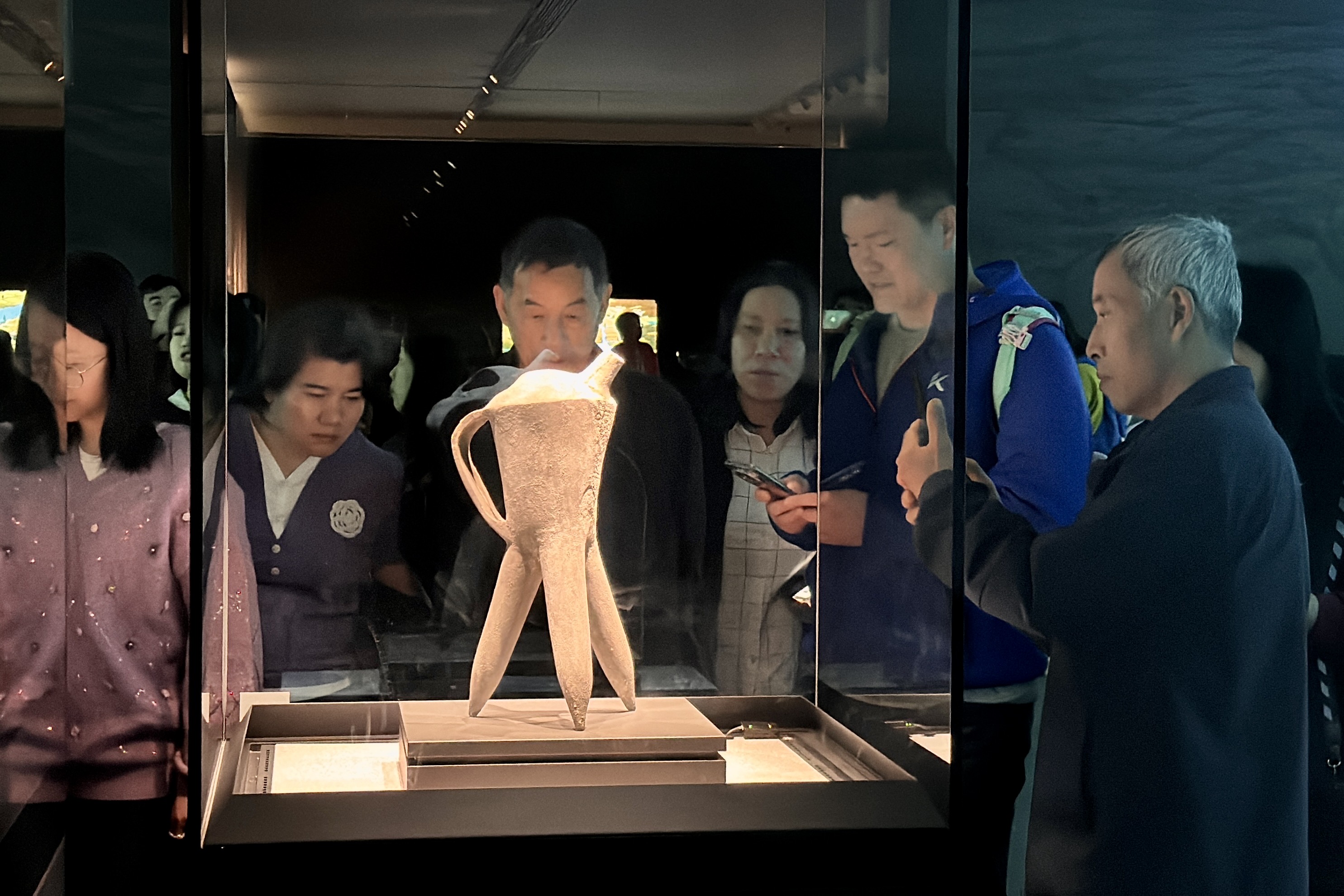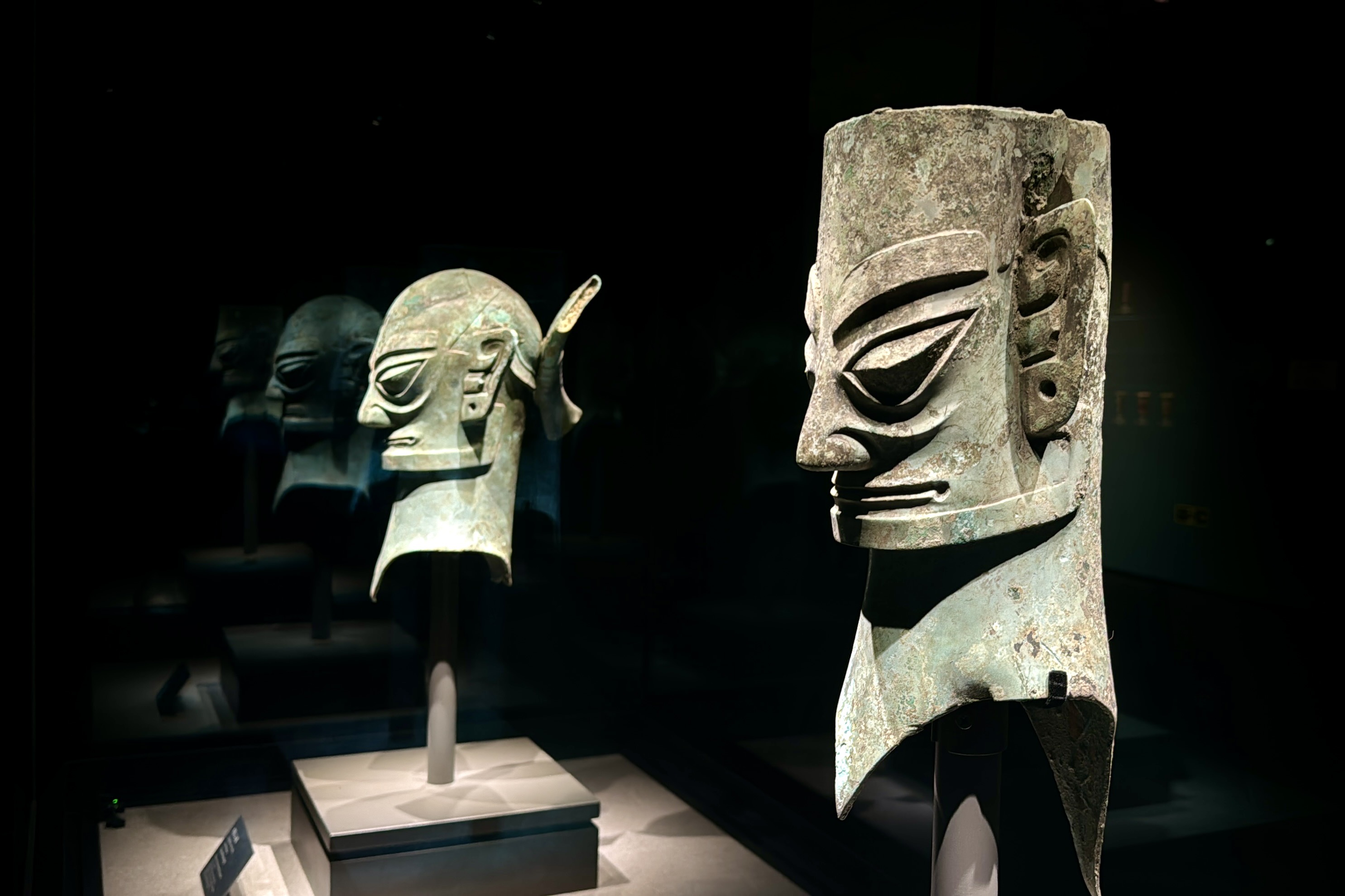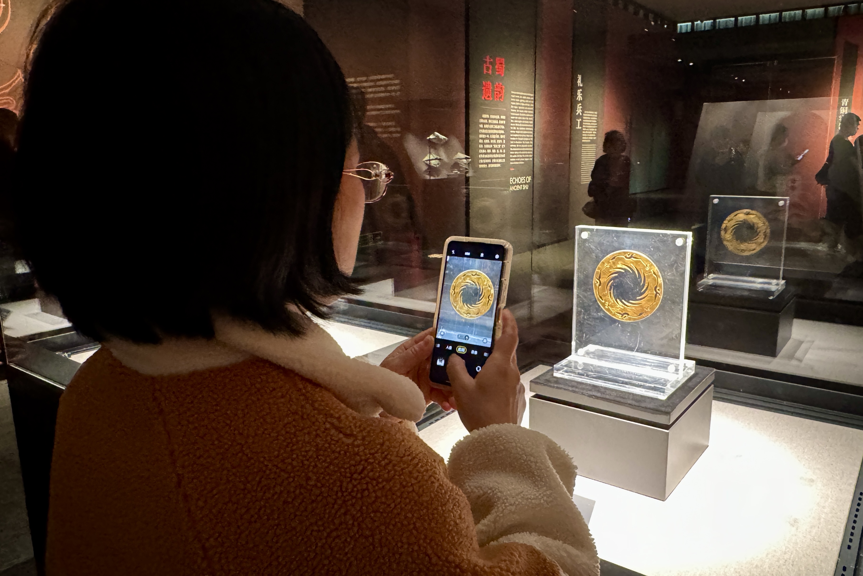 其中,集中展示三星堆遺址和金沙遺址出土文物的「古蜀華章」展廳內,一端是象徵着人神同形、人神合一的巨大青銅戴冠縱目面具,另一端是被認為象徵着在古蜀民中具有極高地位的大人物,正在通天作法的青銅立人像(仿製品),在兩個重要文物拉開的縱深空間中,形態各異的青銅人像、各種造型用途不同的玉器、金器、青銅器等陳列兩旁,模擬還原出古蜀人曾經的祭祀場景,給觀眾帶來極為沉浸的觀展體驗。除實物展示外,展覽還結合視頻、投影、VR體驗方式,全方位、多角度地呈現古蜀文明的輝煌成就。