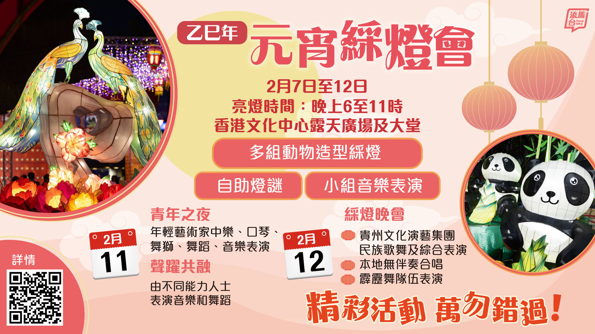 本周三(2月12日)就是元宵節,為了讓市民一同感受節慶歡樂,「乙巳年元宵綵燈會」現正於香港文化中心舉行,展示不同主題的璀璨綵燈,並安排精彩的表演和活動,免費入場,歡迎大家參與。