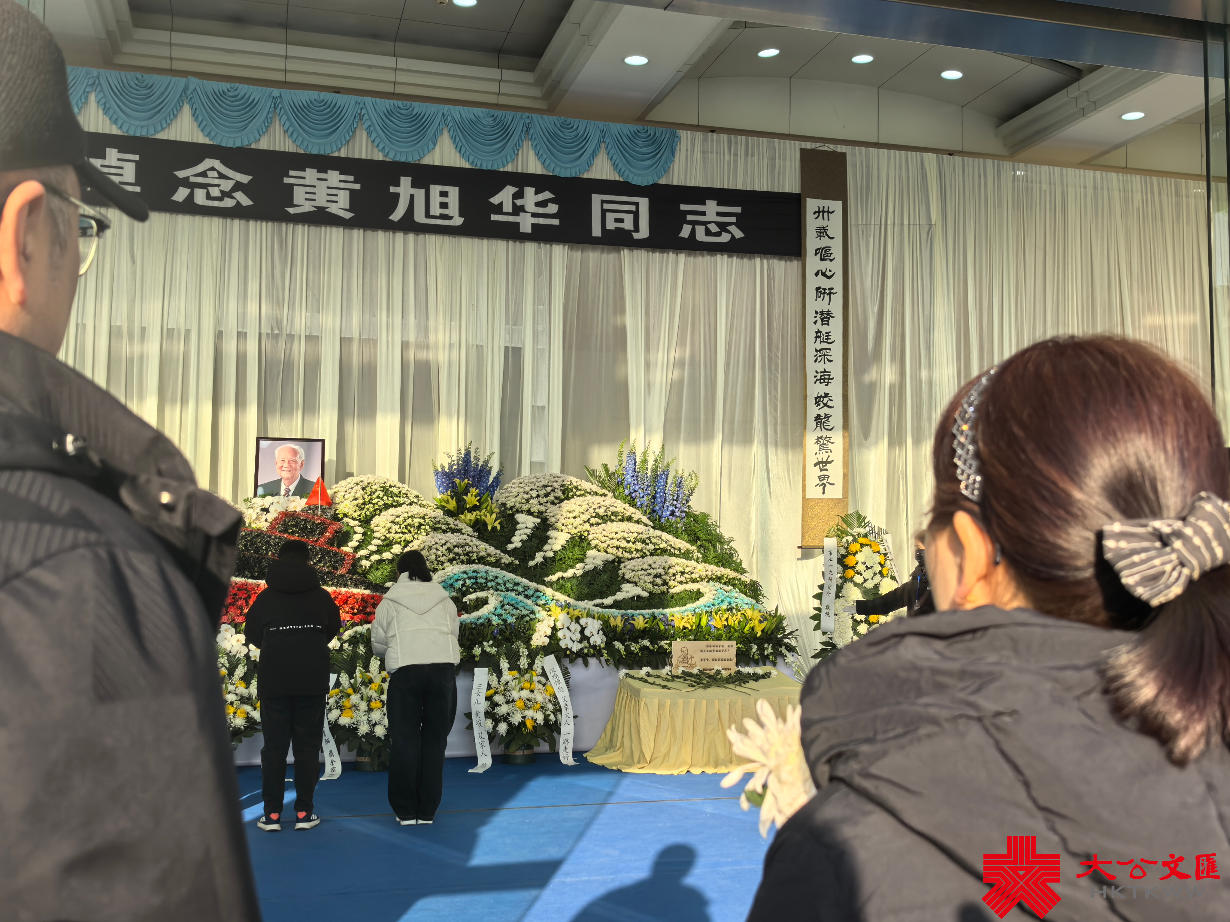 2月10日上午,武昌殯儀館天元廳莊嚴肅穆,哀樂低回,大廳中間掛着黃旭華院士遺像,兩側輓聯分別寫着「卅載嘔心研潛艇,深海蛟龍驚世界」「一生矢志衛海疆,大國重器鑄功勛」。黃旭華的遺體安臥在鮮花翠柏叢中。不少市民自發前來,手持鮮花,神情肅穆,向這位被譽為「中國核潛艇之父」的科學家表達最深切的敬意和哀思。