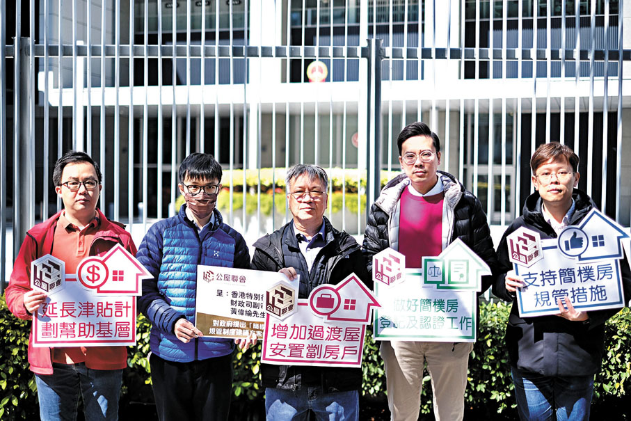 公屋聯會則前往政府總部遞交相關意見書。針對「簡樸房」登記及認證制度,聯會擔心香港分間單位數量眾多,缺乏相應的專業人員於寬限期內,為業主完成「簡樸房」認證工作,建議政府考慮進一步擴大專業人士的認可名單,如曾修讀相關專業培訓課程人士等也納入名單內,令「簡樸房」認證人手更充裕。同時建議政府延長寬限期,配合業主作出修繕工程的進度。