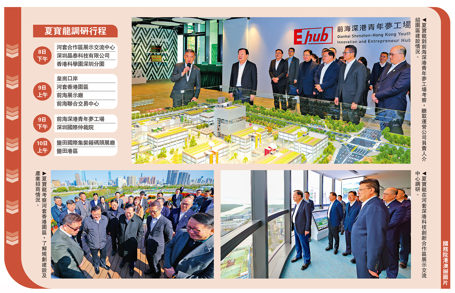 大公報綜合報道,2025年2月8日至10日,中央港澳工作辦公室主任、國務院港澳事務辦公室主任夏寶龍在河套深港科技創新合作區、前海深港現代服務業合作區和鹽田港進行調研。