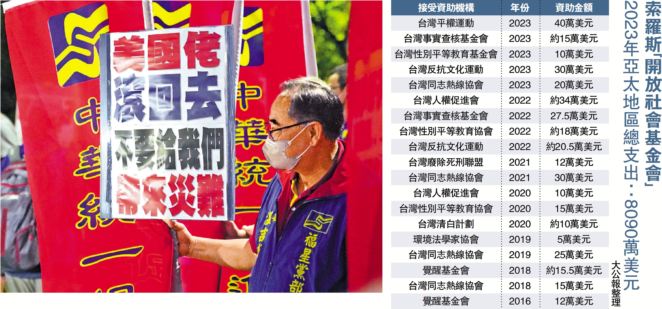 台灣有粉專8日發文指出,「開放社會基金會」是由商人索羅斯設立,其目的是在全世界推進「顏色革命」,為世界和平亂源之一。粉專列舉,「開放社會基金會」是美國國際開發署白手套之一,在2016-2023間,包括「台灣廢死聯盟」等,直言多是綠營外圍側翼。