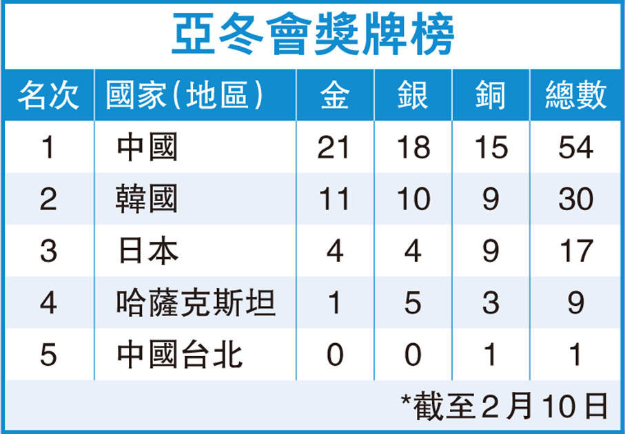 (香港文匯報 記者 王欣欣、于海江 哈爾濱報道)哈爾濱亞冬會速度滑冰女子3,000米比賽於昨日舉行,結果3中國女將楊濱瑜、韓梅和太智恩表現出色,其中小將楊濱瑜以4分08秒54獲得冠軍,韓梅和太智恩則分列2、3名。中國速度滑冰隊也繼女子1,500米和男子5,000米賽事後,在本屆亞冬會上第三次包攬金銀銅牌。