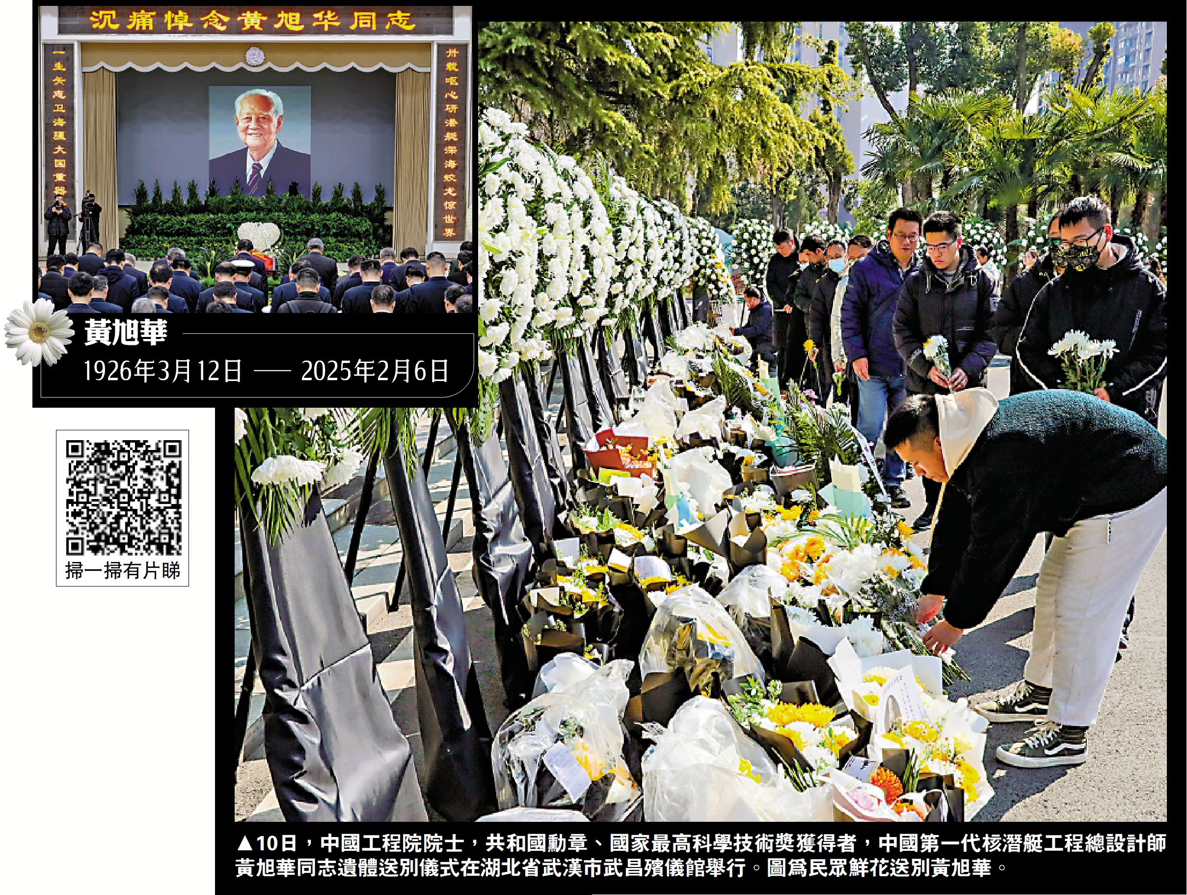(大公報 記者 張帥 武漢報道)中國工程院院士、中國第一代核潛艇工程總設計師黃旭華因病醫治無效,於2月6日20時30分在湖北武漢逝世,享年99歲。2月10日上午,黃旭華遺體送別儀式在武昌殯儀館舉行,前去悼念的人群絡繹不絕,萬餘人手捧鮮花送別,武漢地鐵也打出「國士遠行,深海永念」等標語,致敬這位「核潛艇之父」。連日來,社會各界人士參加弔唁,民眾幾乎買光了武漢市內的鮮花,沿弔唁場所周邊的圍牆擺滿,一路延伸,「傾盡一城花,只為奠一人」。
