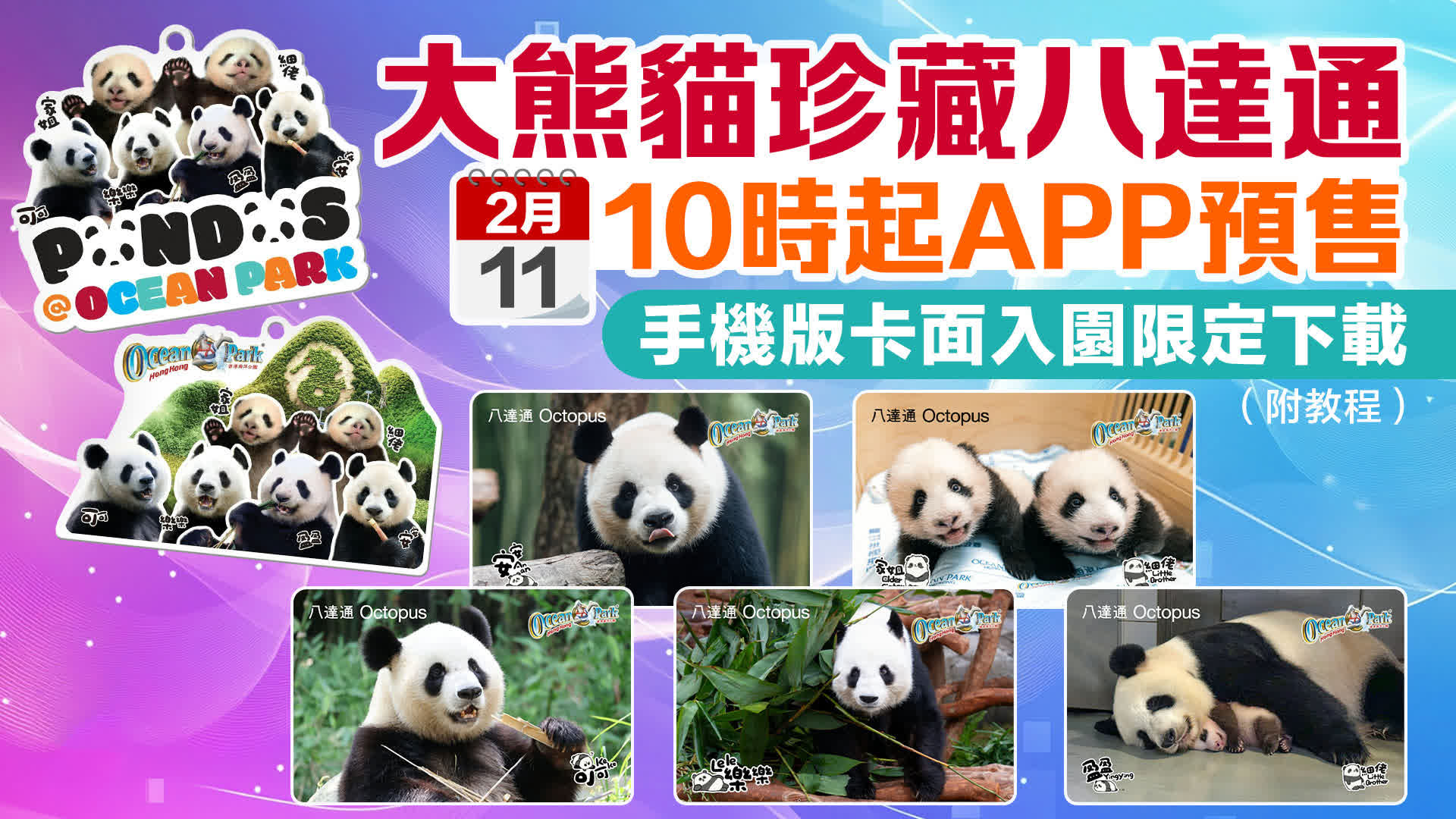 而大熊貓樂樂、盈盈、家姐及細佬的手機八達通卡面動畫,將由2月15日至5月14日,在「大熊貓之旅」開放免費下載。