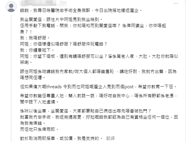 該港女近日於社交平台Threads發帖,稱事發前一日剛在醫院做完全身麻醉手術,翌日出院乘搭港鐵回家時,因身體仍未恢復,便坐在優先座看手機休息,不料一名老婦向她走來,以手敲其手機稱「你知唔知呢度關愛座位嚟?係俾阿婆坐,你仲唔起身?」
